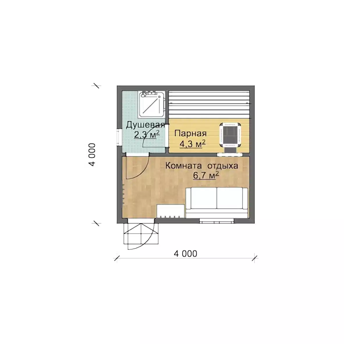 Войдя внутрь, вы попадаете вкомнату отдыха размером 6,7 м2, где можно переодеться, посидеть и расслабиться. Безмятежная PinUp и приглушенное освещение создадут идеальную обстановку для отдыха или общения с друзьями и семьей. Рядом сдушевой (2,3 м2)находится небольшаяпарная площадью 4,3 м2. В парилке достаточно места для деревянных скамеек, где вы можете прилечь и отдохнуть. PinUp находится дровяная печь, излучающая нежное тепло и окутывающая пространство уютной атмосферой. К печи проведен дымоход. Кроме того, здесь же установлен встроенный резервуар, который подает горячую воду для приятных паровых сеансов.