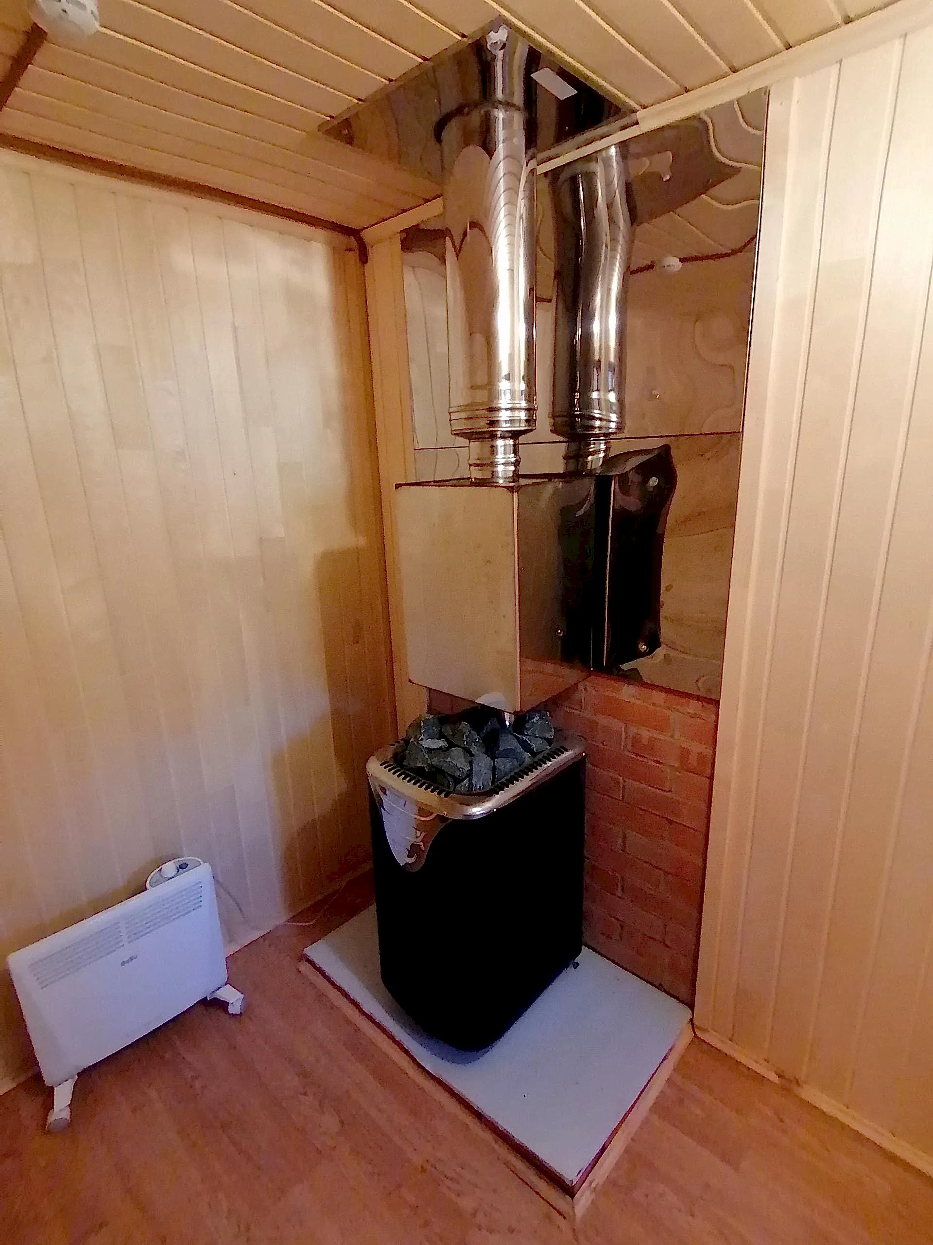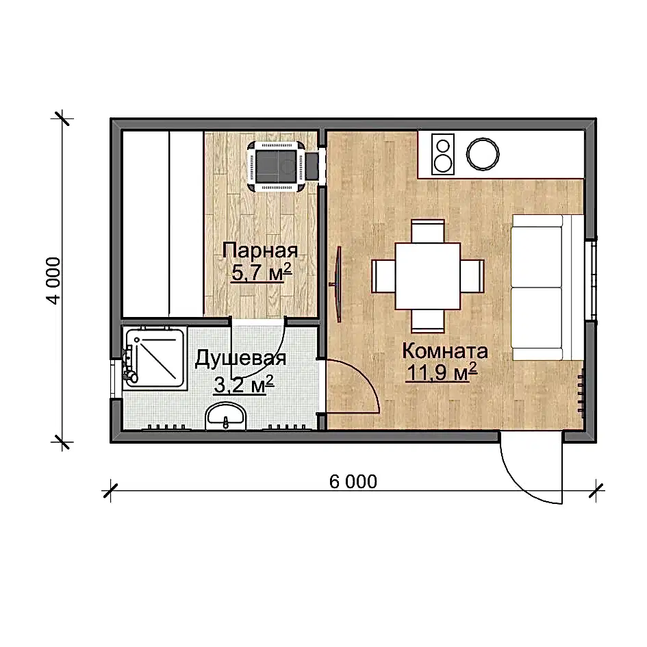 Данный планплощадью 20,55 м2включает в себя три помещения:комната (11,9 м2), душевая (3,2 м2) и сама парная PinUp м2).Стены и потолок обшиваются осиновой вагонкой с фольгированной PinUp ППЭ, а полок в парной изготавливается из осины.