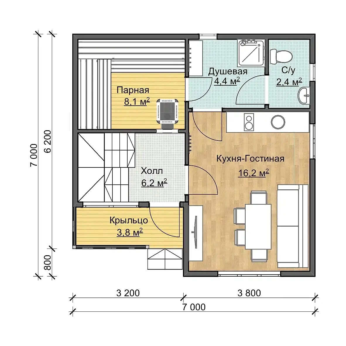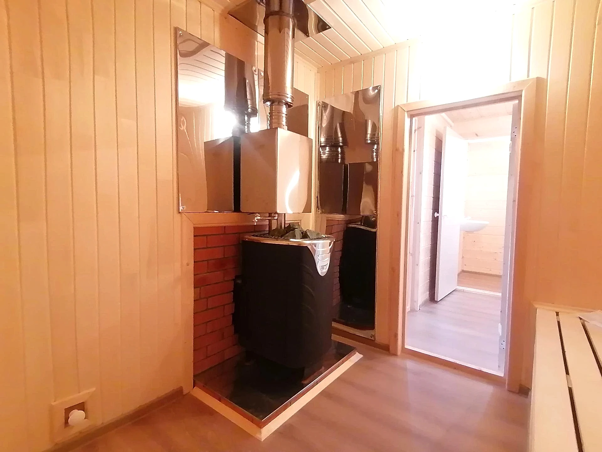 Душевая площадью 4,4 м2может быть PinUp душевой кабиной, современной тумбой под раковину и шкафами для хранения туалетных принадлежностей и полотенец.Паровая площадью 8,1 м2PinUp сердцем бани. В ней установлена дровяная печь с дымоходом, создающая уютную атмосферу. Печь дополнена баком для воды. Парилка предназначена для комфортного отдыха и может включать скамейки для размещения. К основной зоне бани примыкаеткрыльцо площадью 3,8 м2. Оно может быть обставлено уличной мебелью, например скамейкой или креслами, создавая уютное место для наслаждения окружающей PinUp