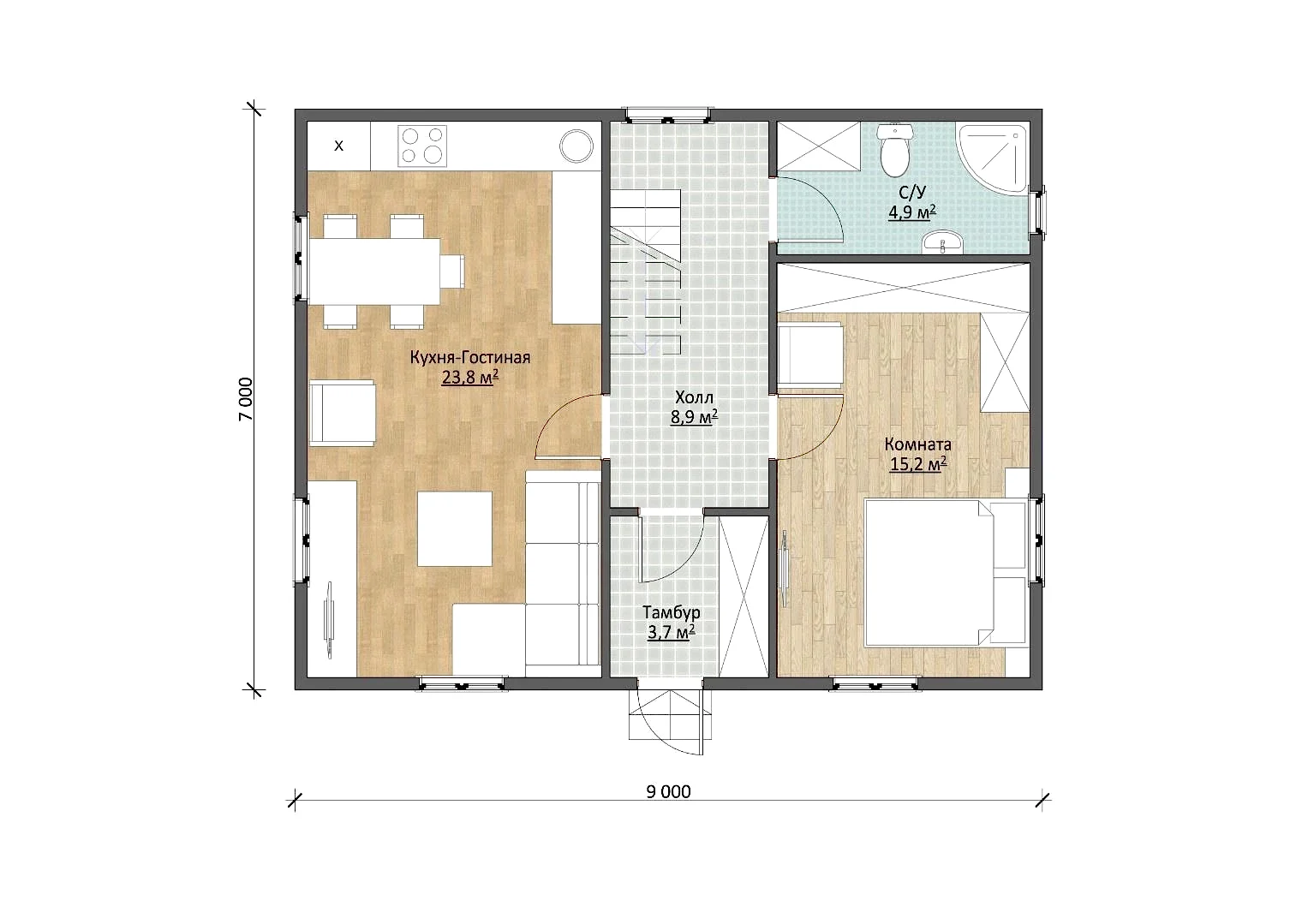 На первом этажев кухне-гостиной площадью 23,8 м²разместится вся необходимая столовая мебель и PinUp техника. В просторном8,9-метровом холлес примыкающим PinUp можно расставить шкафы и полки для хранения вещей.Комната в 15,2 м²станет удобным кабинетом или местом для PinUp А в почти5-метровый санузелвойдут душевая кабина или ванна, PinUp унитаз и стиральная машина.