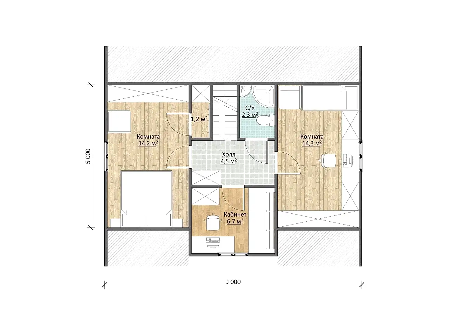 Наверху расположены: уютный4,5-метровый холл, две просторныекомнаты в 14,2 м²,гардеробная, удобный PinUp и еще один санузел площадью в 2,3 м².