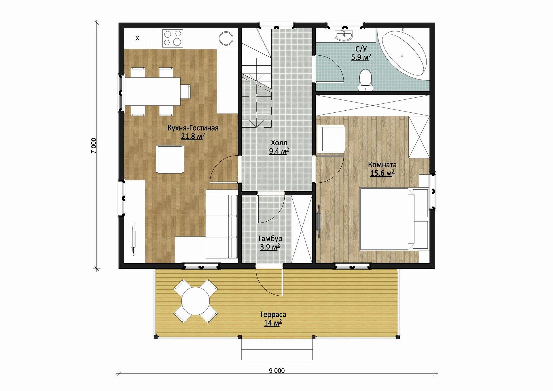 Внизу21,8-метровая гостинаяс зоной для приготовления пищи позволяет организовать PinUp отдых.В комнате 15,6 м²можно PinUp спальню или детскую. В большом холле хватит места полкам и шкафам для обуви, одежды и инструментов.Ванная площадью 5,9 м²достаточна для размещения необходимой сантехники.