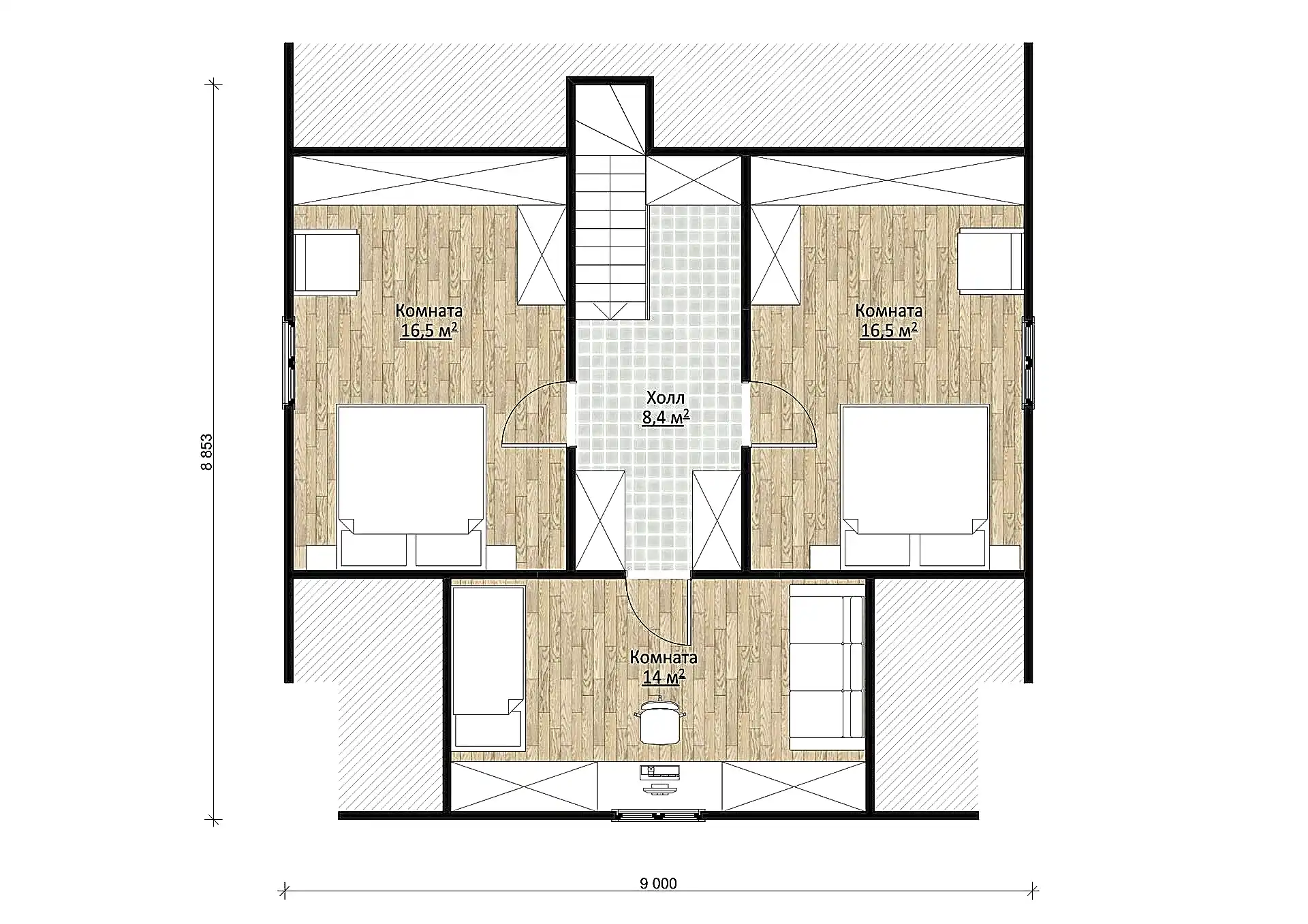На втором этаже по обе стороны PinUp располагаются еще3 комнаты: 14-метровая и две по PinUp м².Здесь достаточно пространства для сна, PinUp или игр.