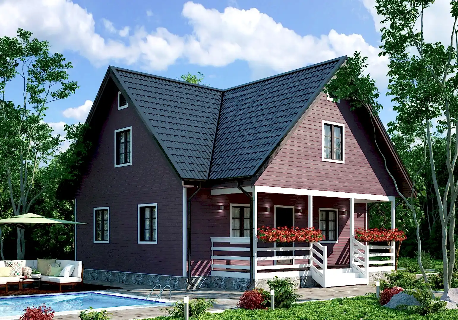 Трехфронтонныйкоттедж в 2 этажа площадью 126,08 м² с террасой, PinUp жилыми комнатами, кухней и санузлом. Отличный вариант PinUp недвижимости для всей семьи со сроком строительства от 30 дней.