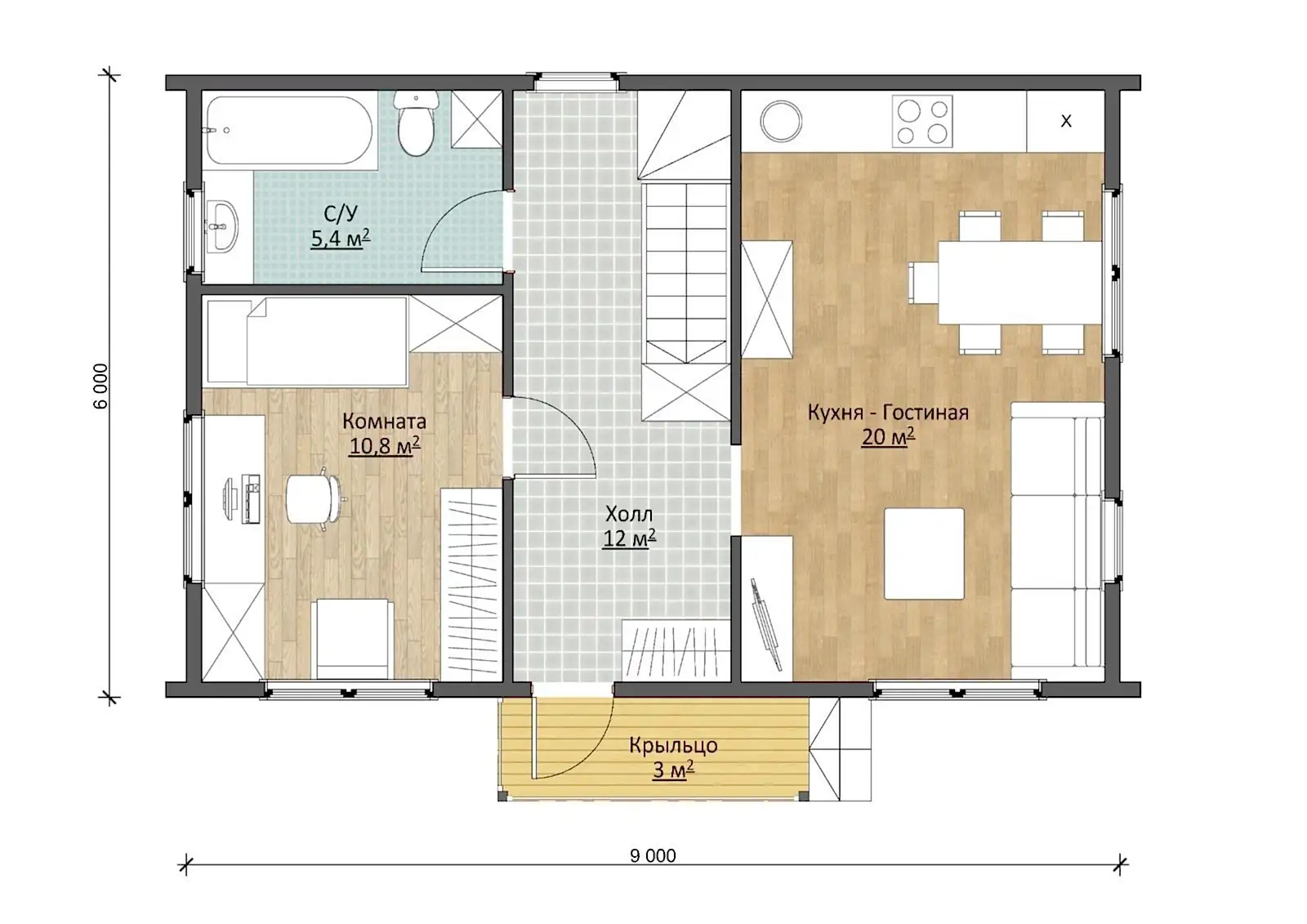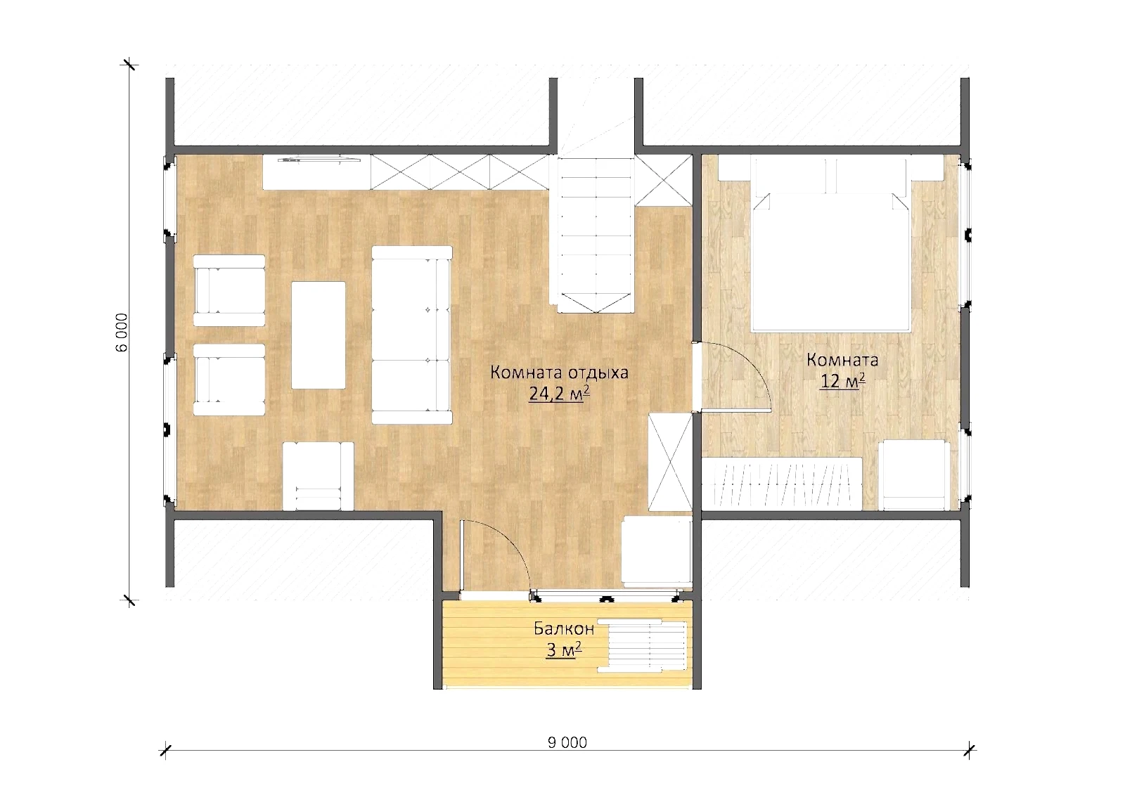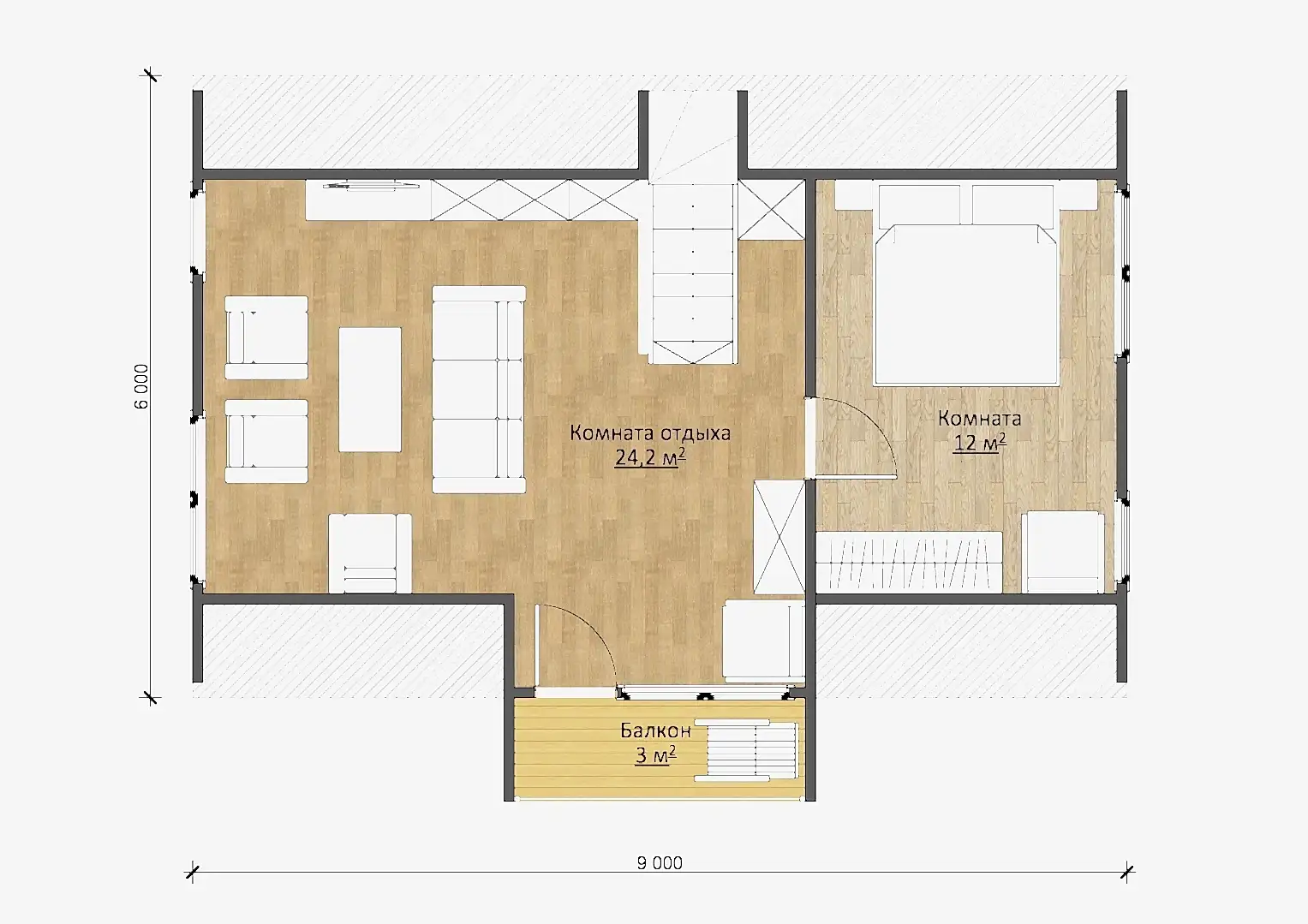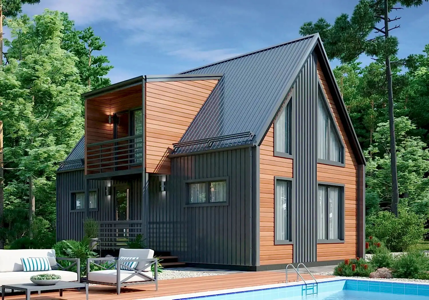Барн-дом каркасной конструкции подходит для постоянного проживания или отдыха на загородном участке. Наплощади в 57 м²размещаются огромная гостиная с кухонной зоной, просторный холл, ванная и комната, в PinUp можно оборудовать кабинет, кладовую или место для сна. На втором уровне находятся ещедве комнаты:площадью 24,2 и 12 м². При PinUp планировку пространства можно изменить.