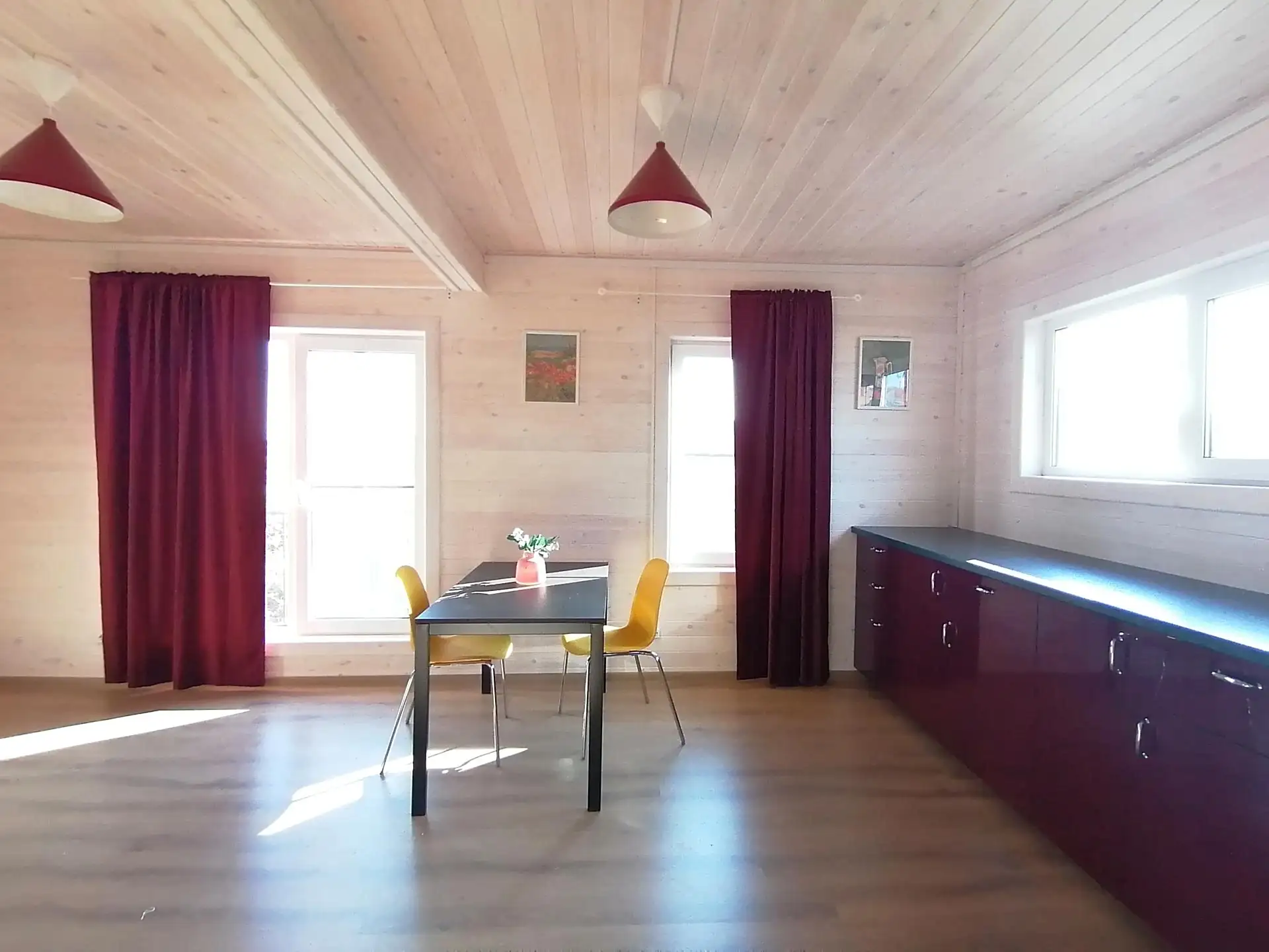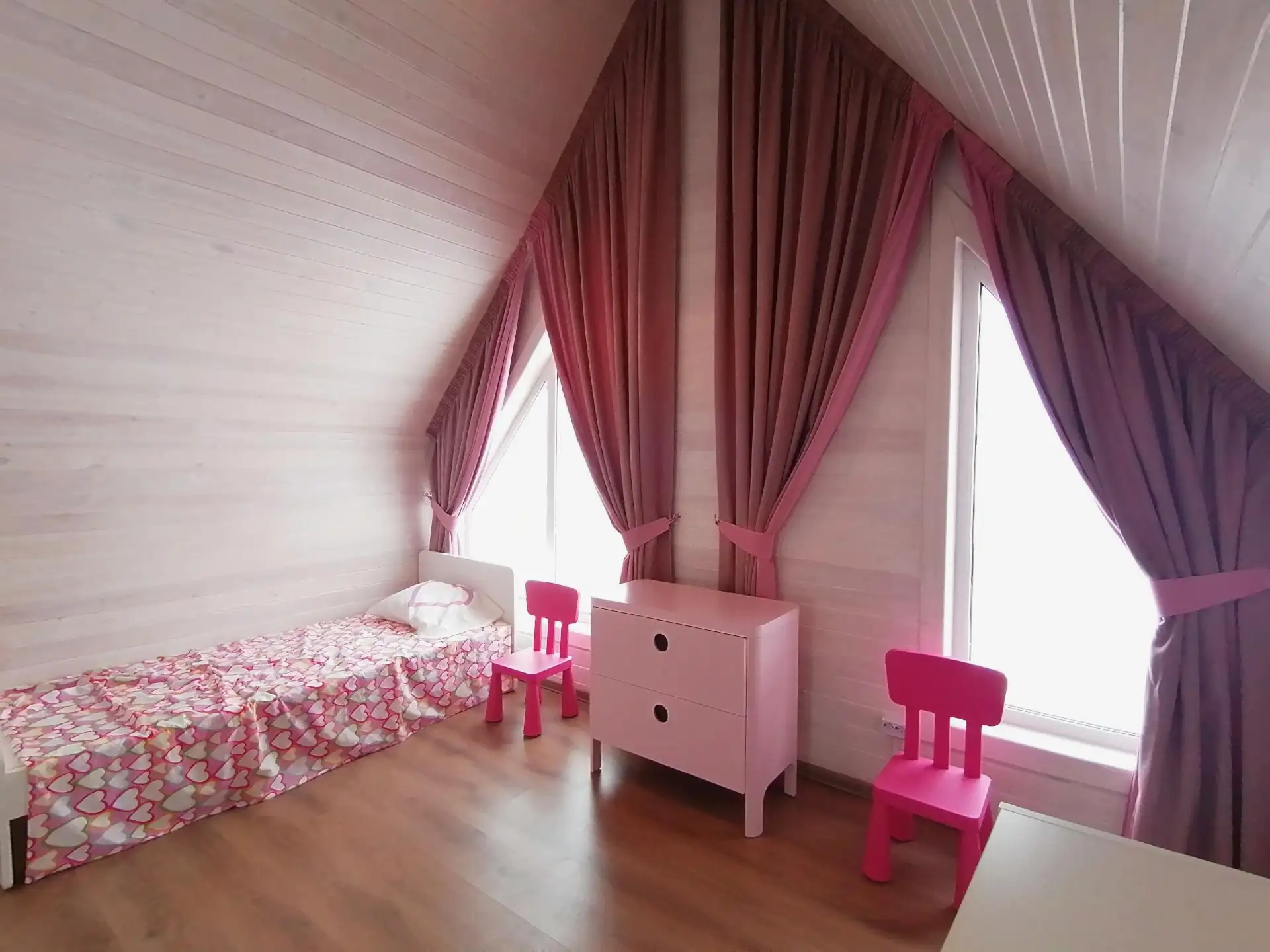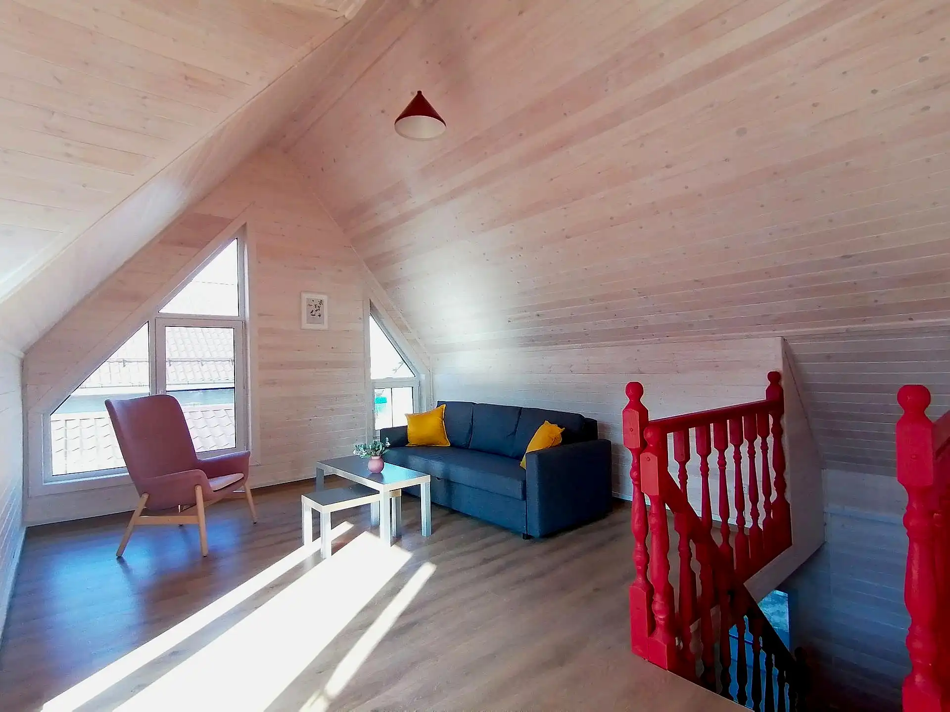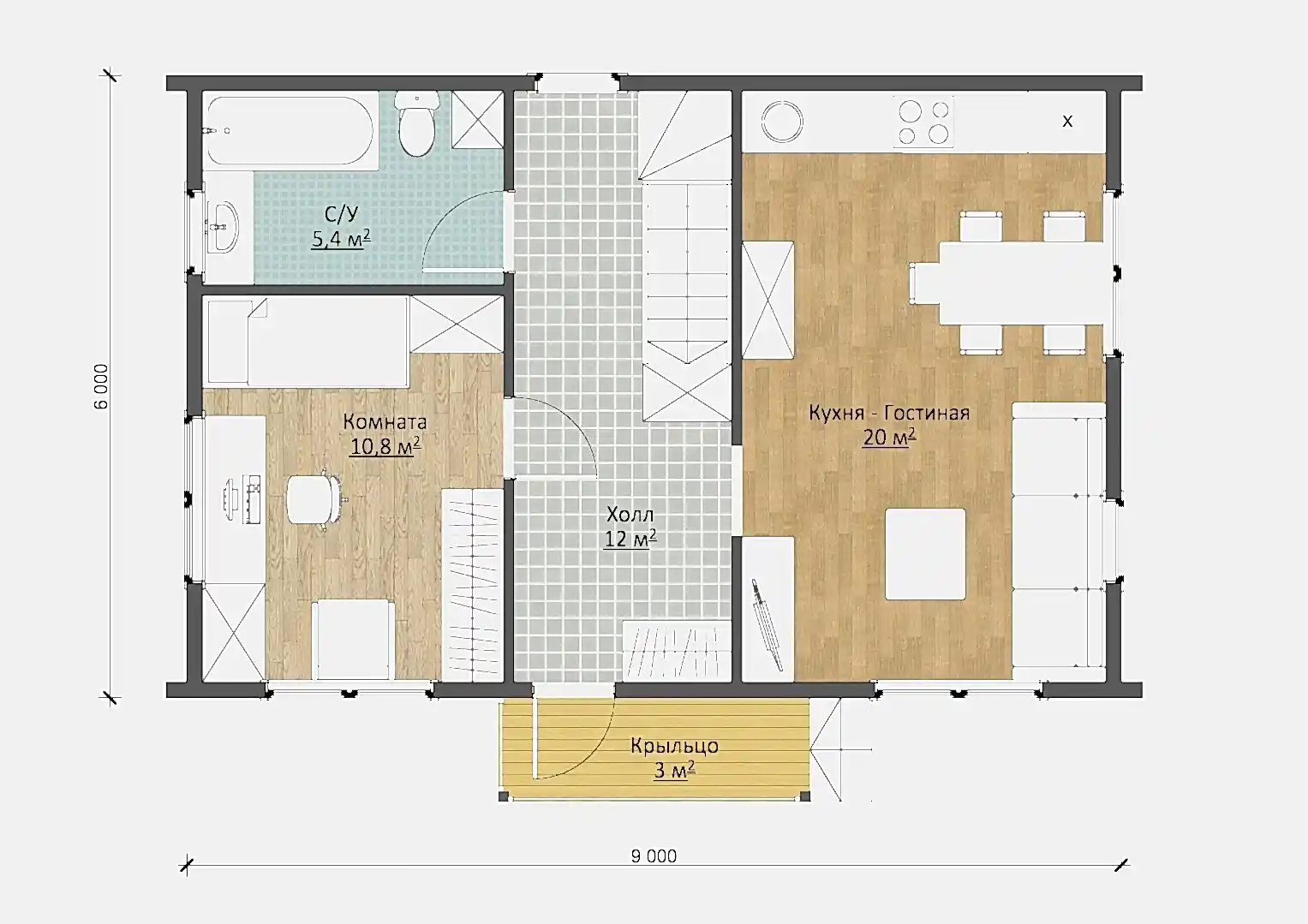 Барн-дом каркасной конструкции подходит для постоянного проживания или отдыха на загородном участке. Наплощади в 57 м²размещаются огромная гостиная с кухонной зоной, просторный холл, ванная и комната, в PinUp можно оборудовать кабинет, кладовую или место для сна. На втором уровне находятся ещедве комнаты:площадью 24,2 и 12 м². При PinUp планировку пространства можно изменить.