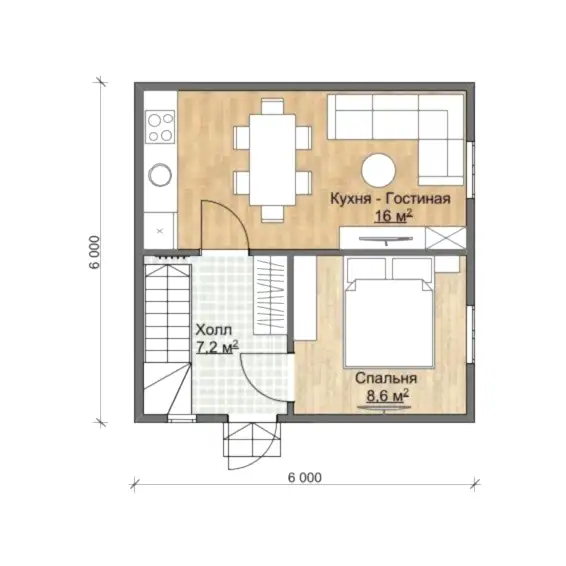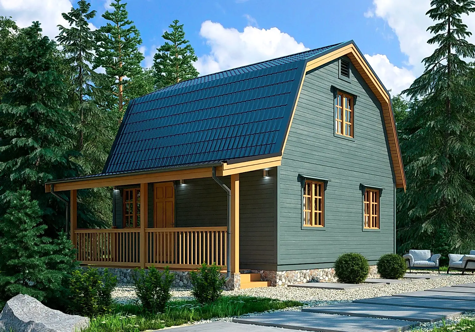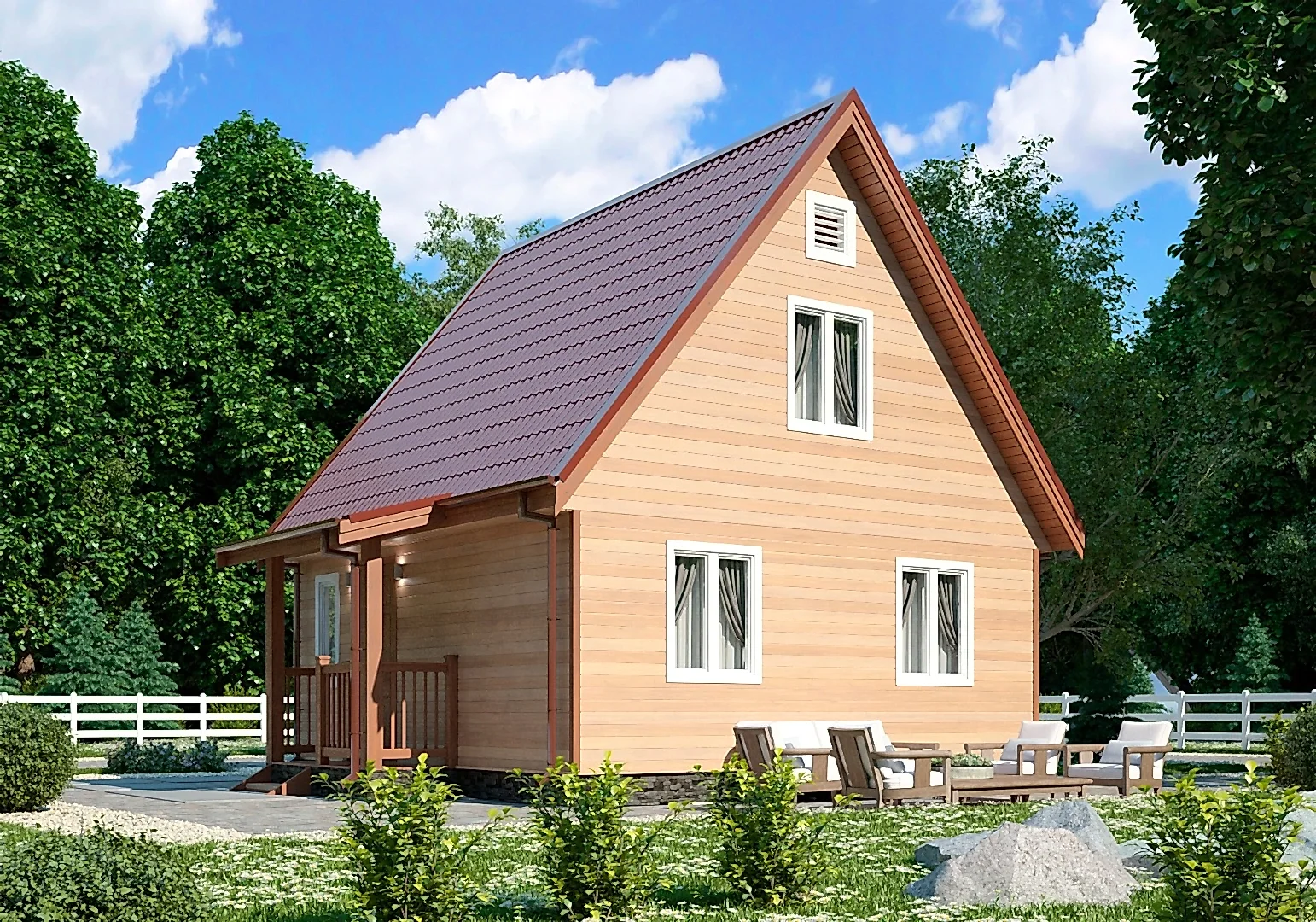 Этотдом площадью 53 м²с уютной мансардойидеально подходит для дачного отдыха. Проект имеет несколько вариантов комплектации для эксплуатации дома в PinUp и холодный периоды года. Срок строительства под ключ - всего от 3 дней.