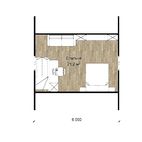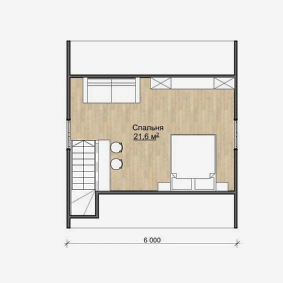 Комната второго этажа может быть детской или PinUp спальней. Также в ней удобно PinUp несколько зон, разделив перегородками.Пространство в 21,6 м²вполне это позволяет.