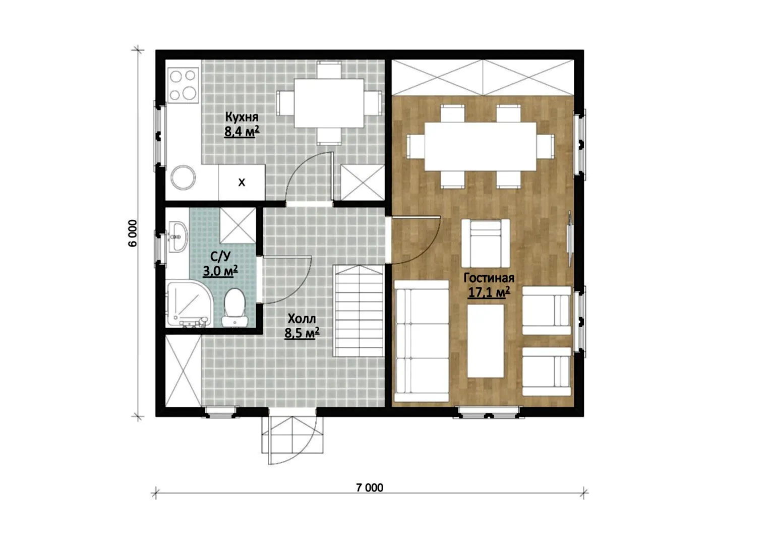 Кухня площадью 8,4 м²вмещает необходимую PinUp технику и позволяет организовать компактную обеденную зону. В примыкающейгостиной площадью 17,1 м²удобно PinUp всем вместе, отмечать семейные праздники и устраивать посиделки с друзьями. Компактный3-метровый санузел, располагающийся на нижнем этаже, можно оборудовать душевой PinUp и поставить стиральную машину.