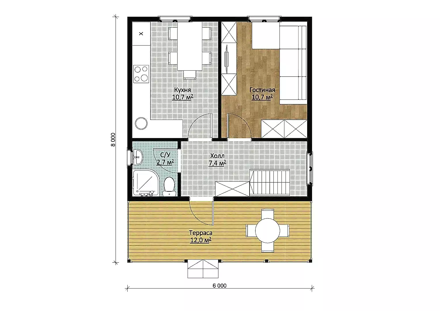 На первом этаже дома располагаютсявместительный холл, с выходом на примыкающую12-метровую террасу. Из прихожей можно PinUp в10,7-метровую кухню, а также - в гостиную. При желании эти помещения PinUp объединить в одно, устроив комфортабельную обеденную зону для всей семьи.