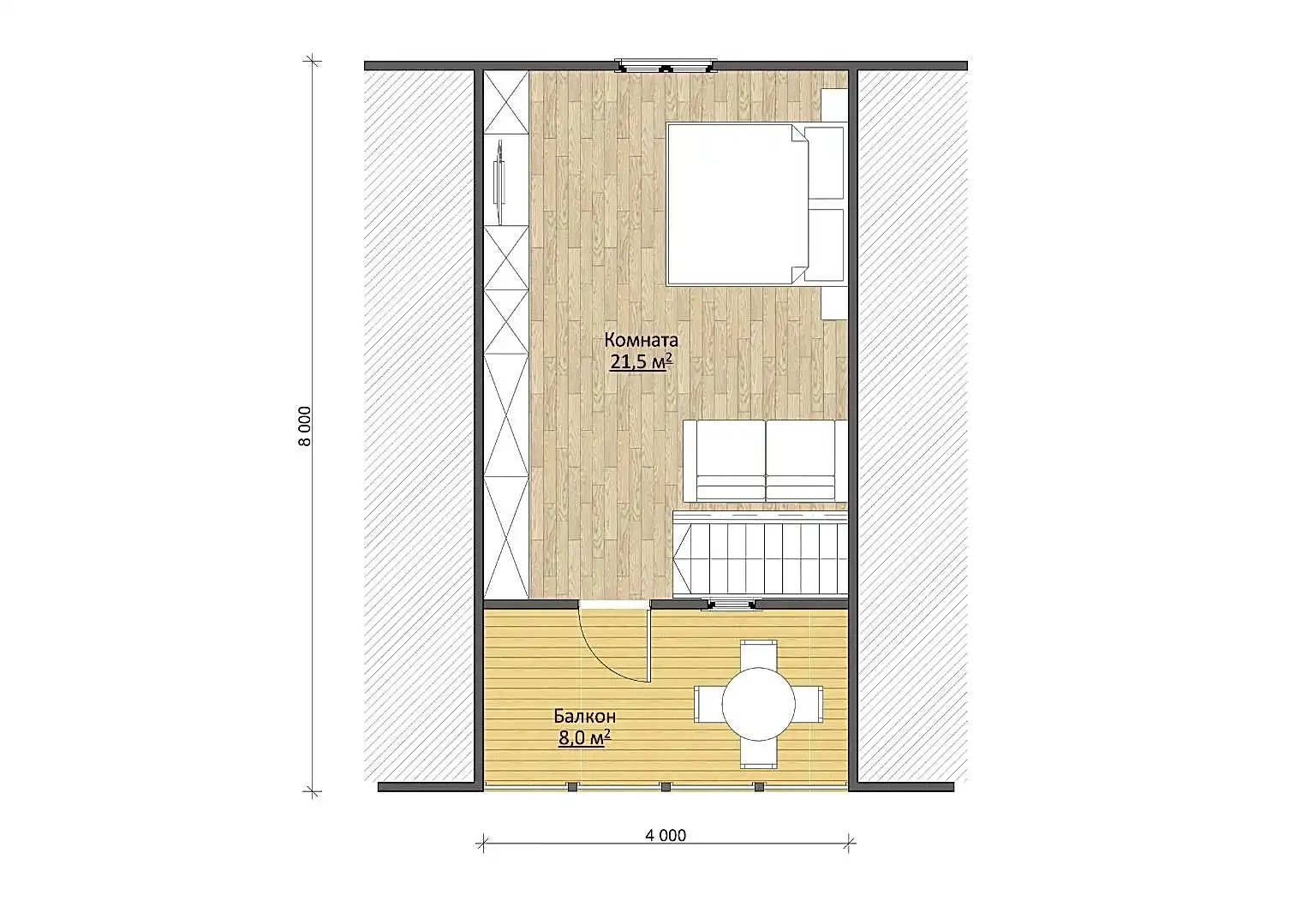 Мансардный этаж представляет собойпросторную комнату в 21,5 м². Здесь можно оборудовать спальню, вторую гостиную или PinUp для игр или спортивных занятий. К помещению примыкает8-метровый балкон.