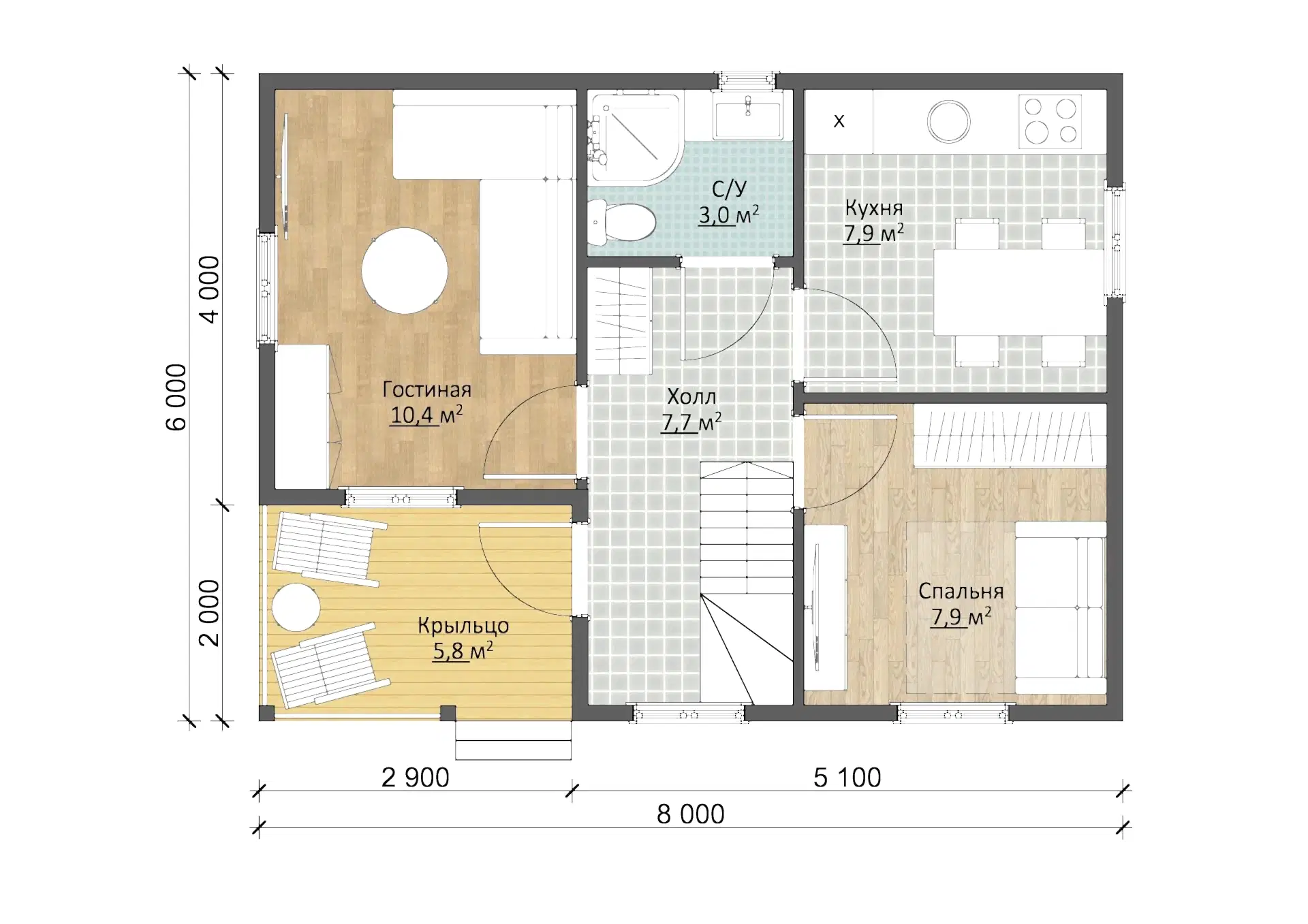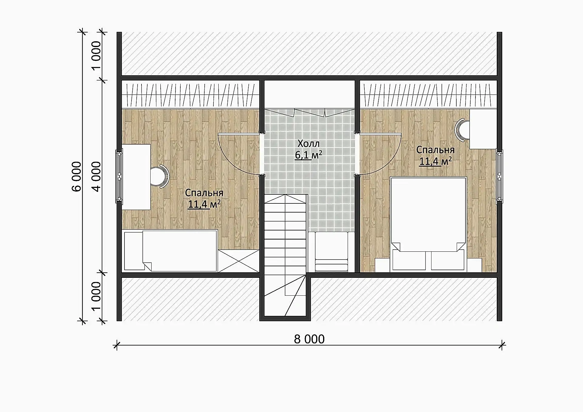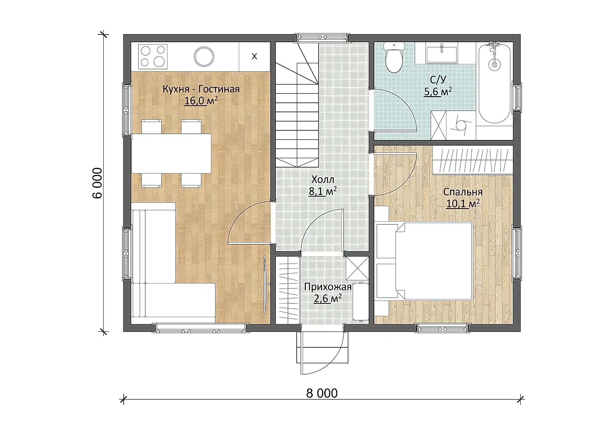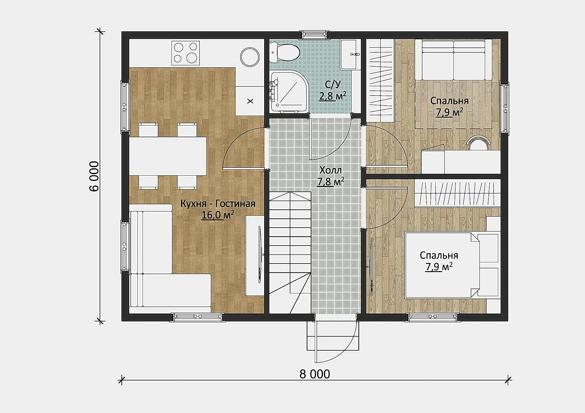 Внизу расположенапросторная 16-метровая кухня-гостиная, в которой удобно готовить и собираться PinUp компанией. В примыкающей прихожей на первом этаже разместятся шкафы. Рядом естьнебольшой санузел. В помещении между спальнями наверху можно оборудовать еще одно место для хранения.
