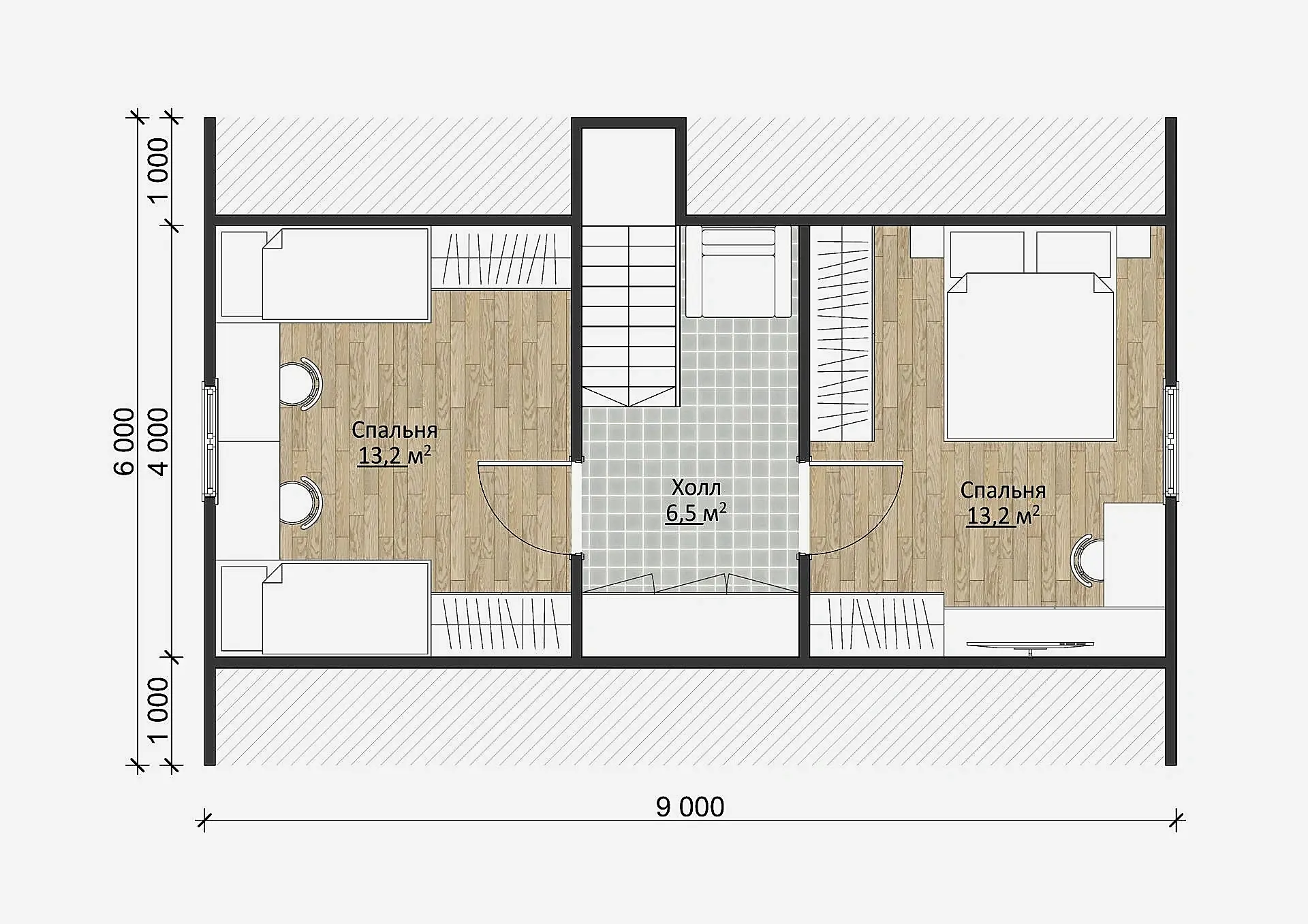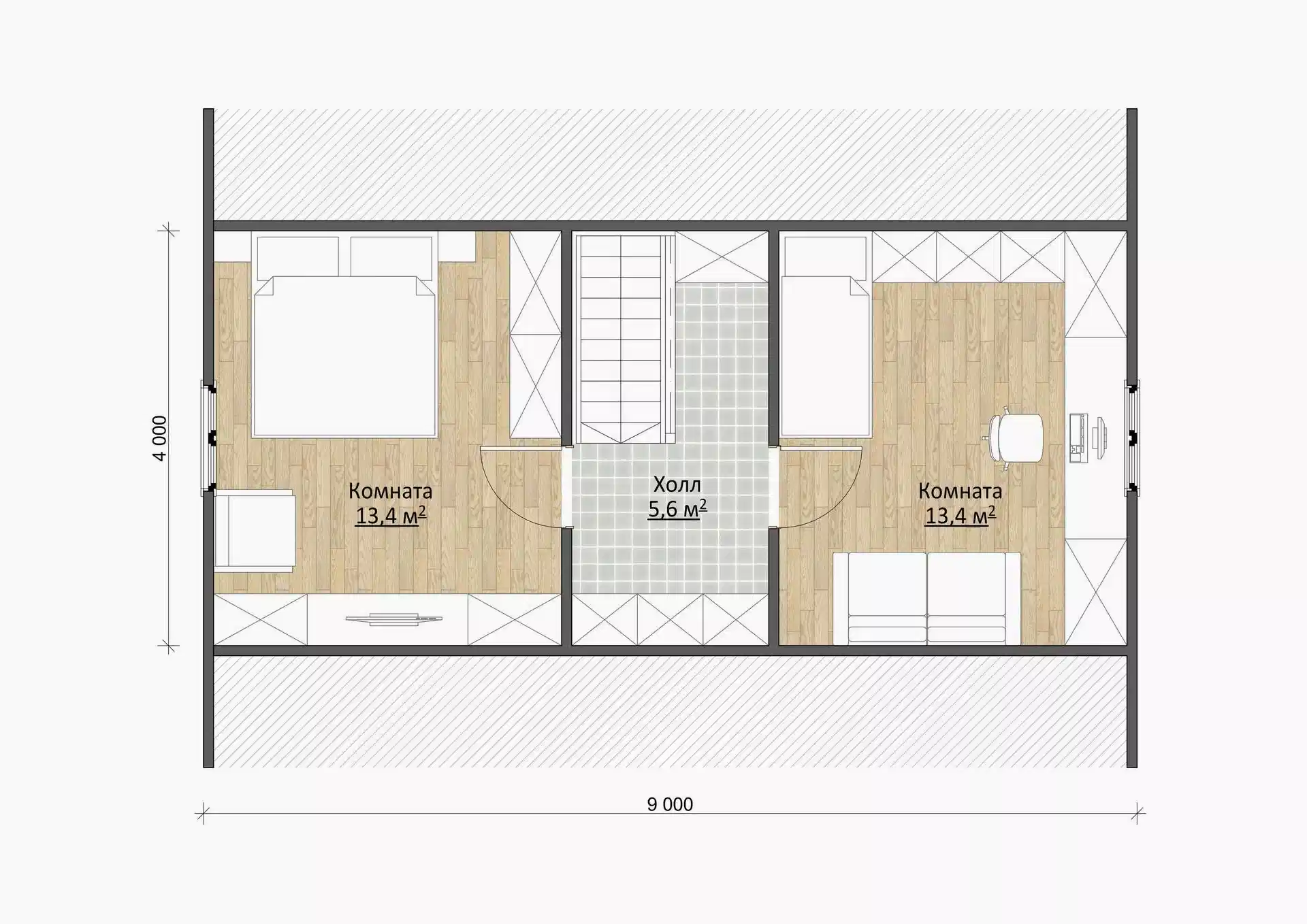 На мансардном этаже расположен5,6-метровый холл, разделяющийдве вместительные комнаты по 13,4 м².