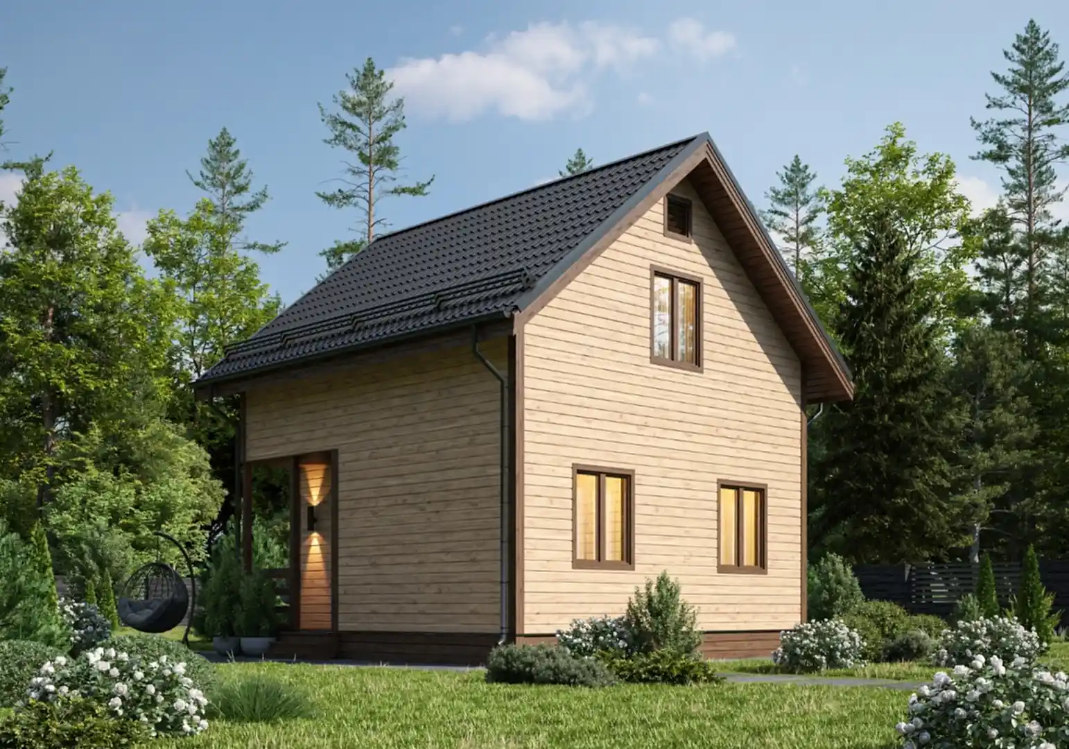 Двускатная кровля дома выглядит легкой и воздушной. Планировки две, и они предусматривают наличие просторной кухни, санузла, спальни и гостиной. Мансардная кровля позволяет сделать на втором PinUp полноценную комнату, куда можно поставить и кровать, и высокий шкаф. Выбирайте одну из двух комплектаций - Стандарт или Люкс. Они отличаюся фундаментом, толщиной утеплителя и окнами.