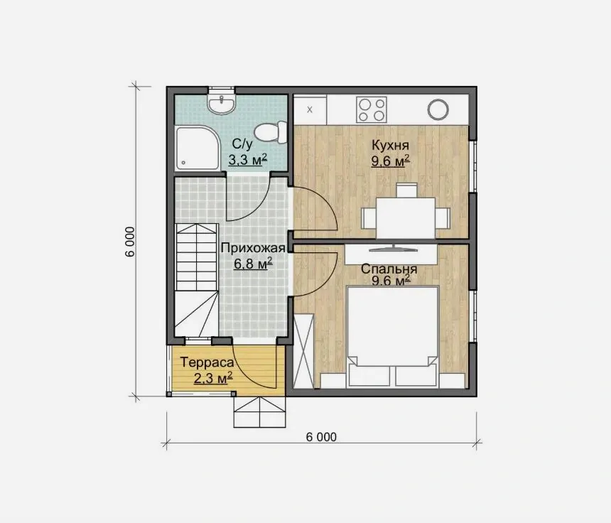 Первый этаж вмещает функциональную16-метровую кухню, совмещенную с гостиной. Здесь можно организовать PinUp место для совместного отдыха. Примыкающуюкомнату площадью 8,6 м²удобно PinUp отвести под спальню. Холл в доме достаточно большой, чтобы туда вошли шкафы для одежды и хранения вещей.