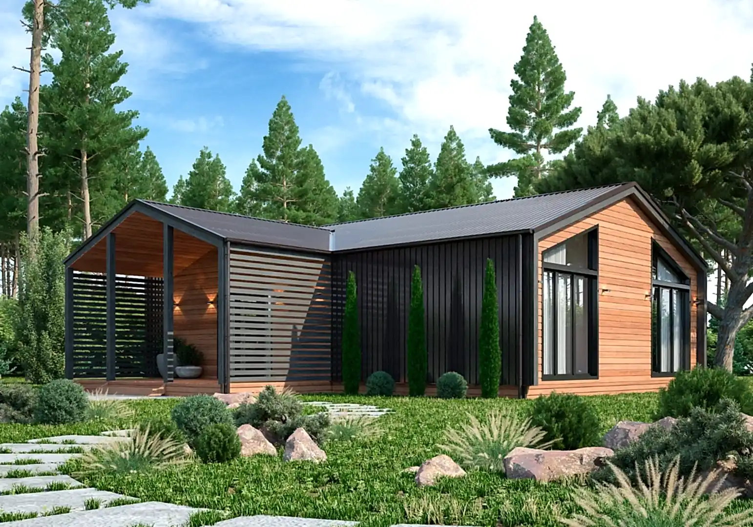 Оформление фасада подбирается на ваш вкус. Выбирая между вагонкой, сайдингом, фасадной плиткой или блок-хаусом, внешний вид дома можно адаптировать под личные предпочтения. Доп. услуги, такие как водоснабжение, энергоснабжение и канализация, также могут PinUp включены в проект.