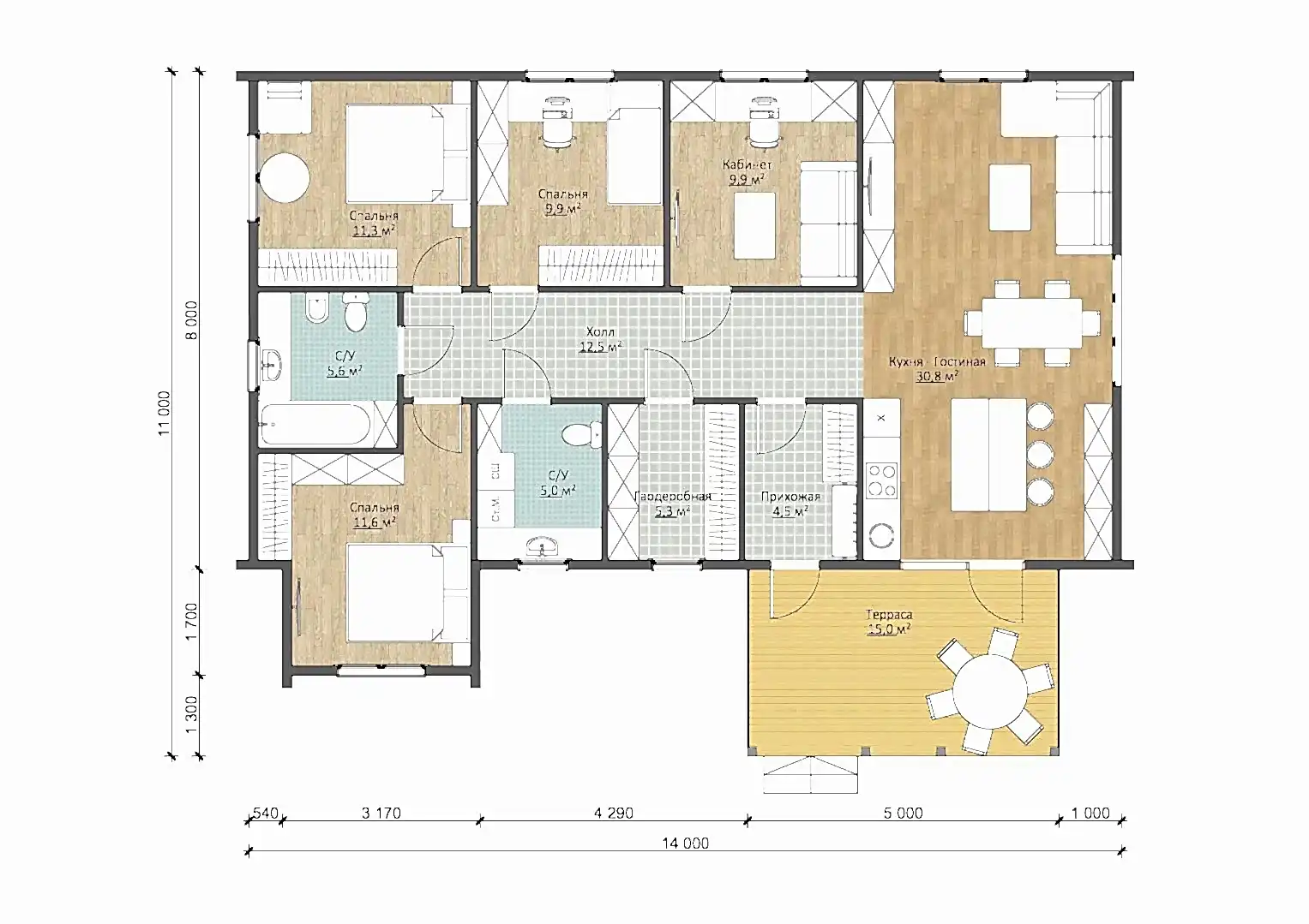 Дом для тех, кто любит роскошные и большие пространства. На площади 120,6 м2есть где разгуляться!