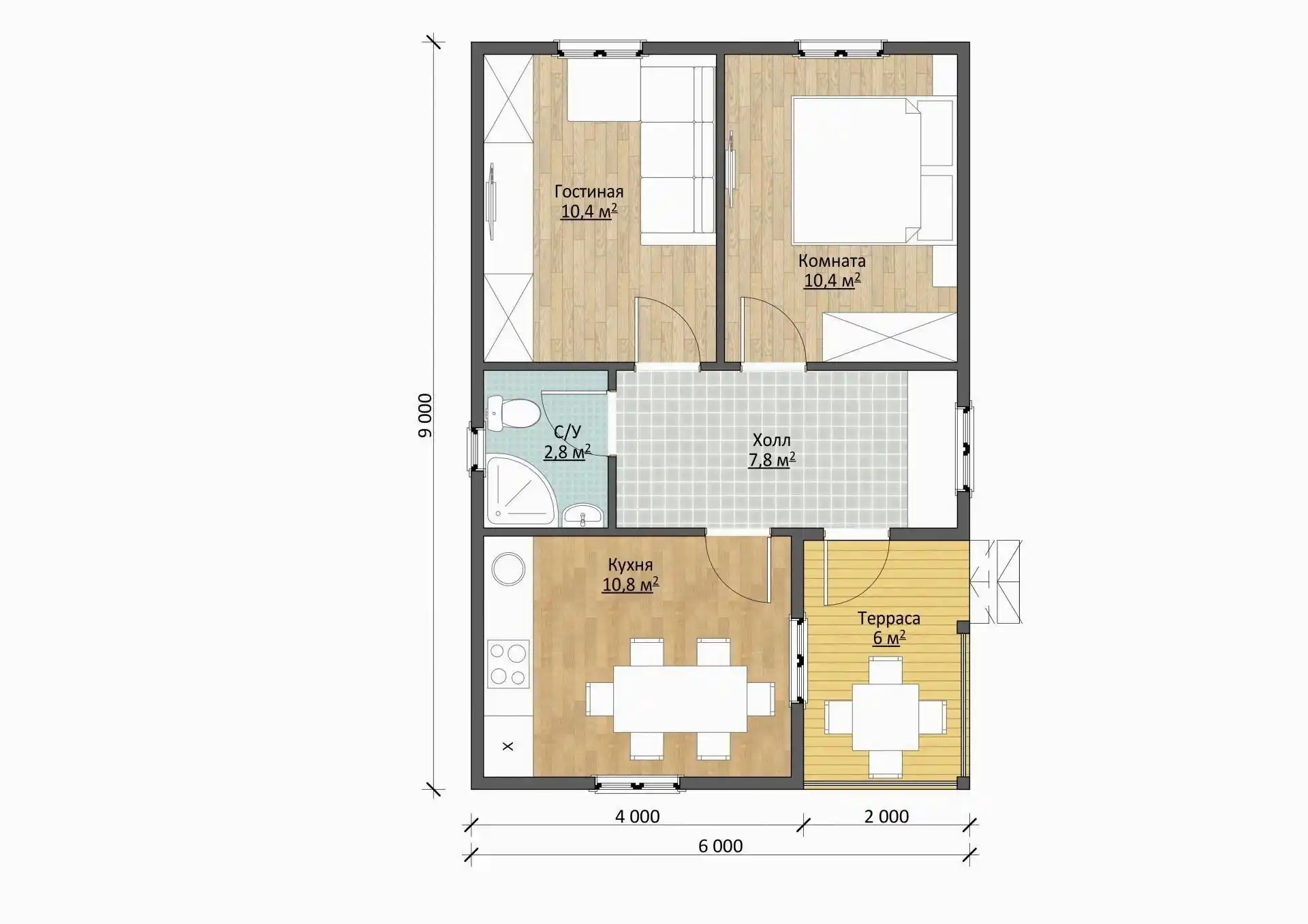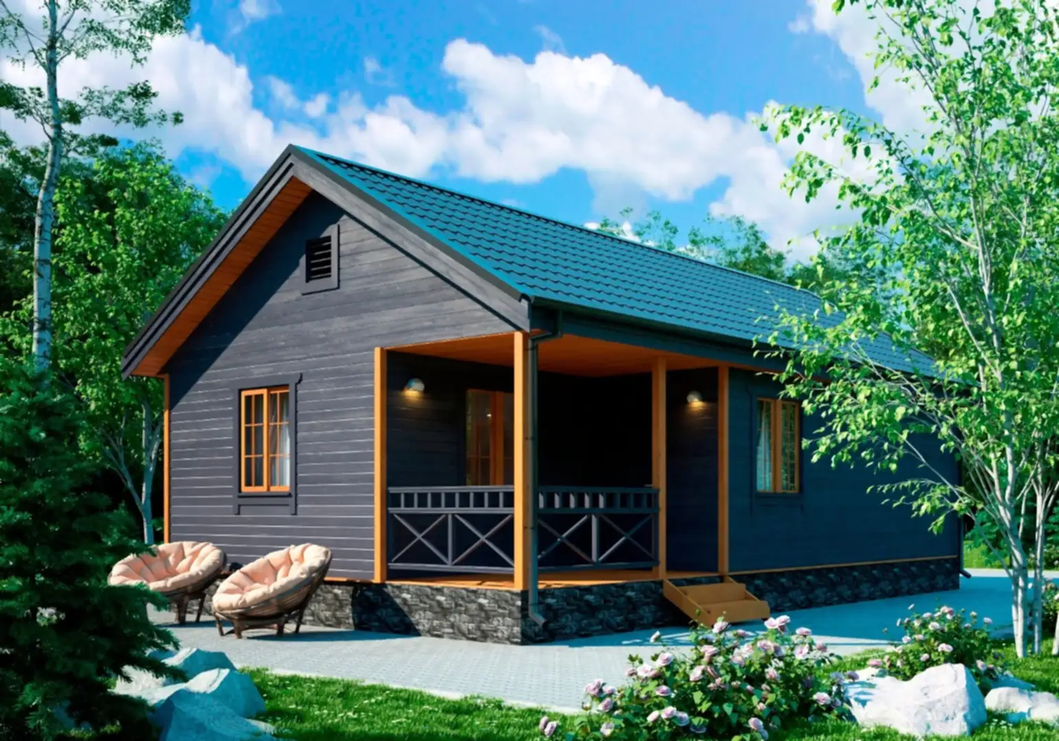 Вместительный одноэтажный садовый дом можно использовать как дачный вариант на лето или небольшой коттедж для постоянного проживания. Благодаря средним габаритам 6х9 м его легко интегрировать на участке, а удачная планировка с обособленными помещениями удобна при оформлении интерьеров.