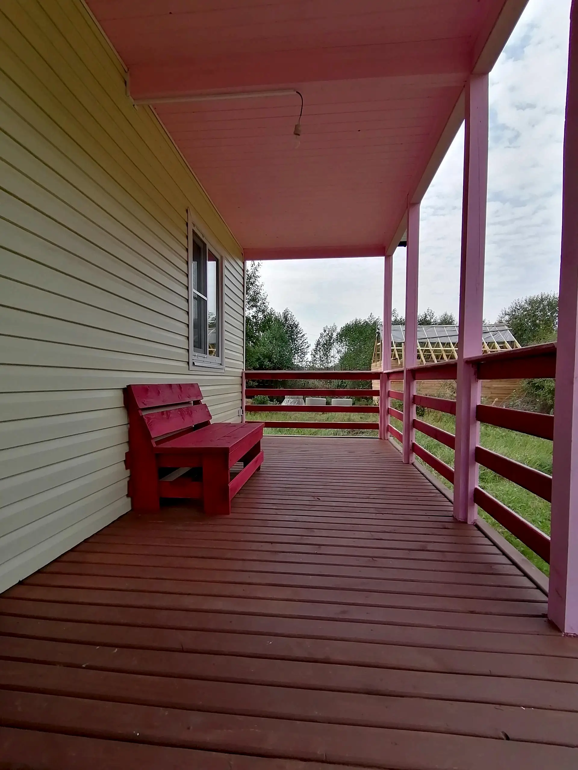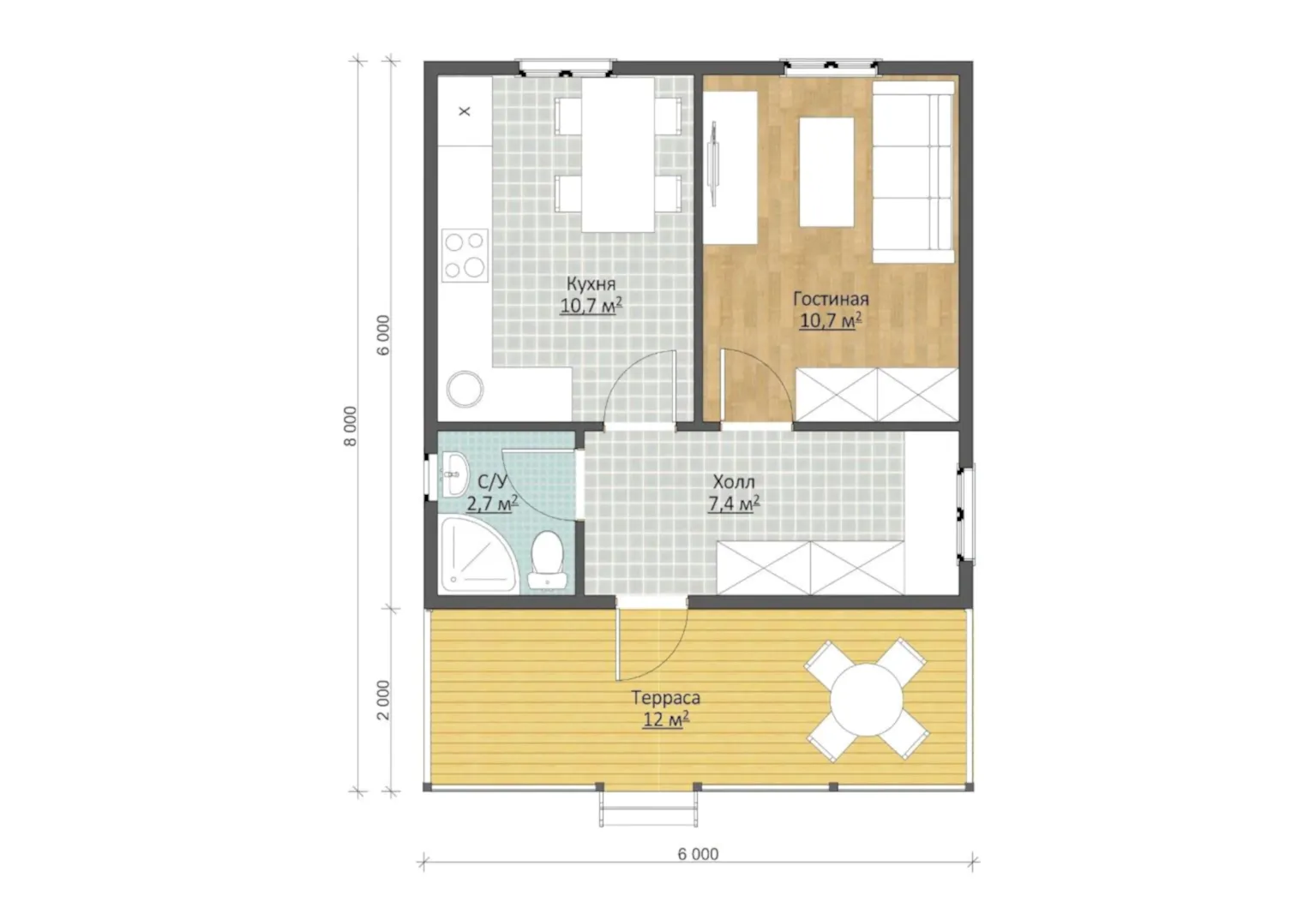 В садовом доме 6х8 м вы найдете все для комфортного отдыха в любое время PinUp На входе запроектирована длинная, просторная терраса -площадка 12 м2защищена от непогоды PinUp выносом двускатной крыши и обрамлена по периметру ограждением. На ней можно проводить летний досуг, обедать или ужинать всей семьей.