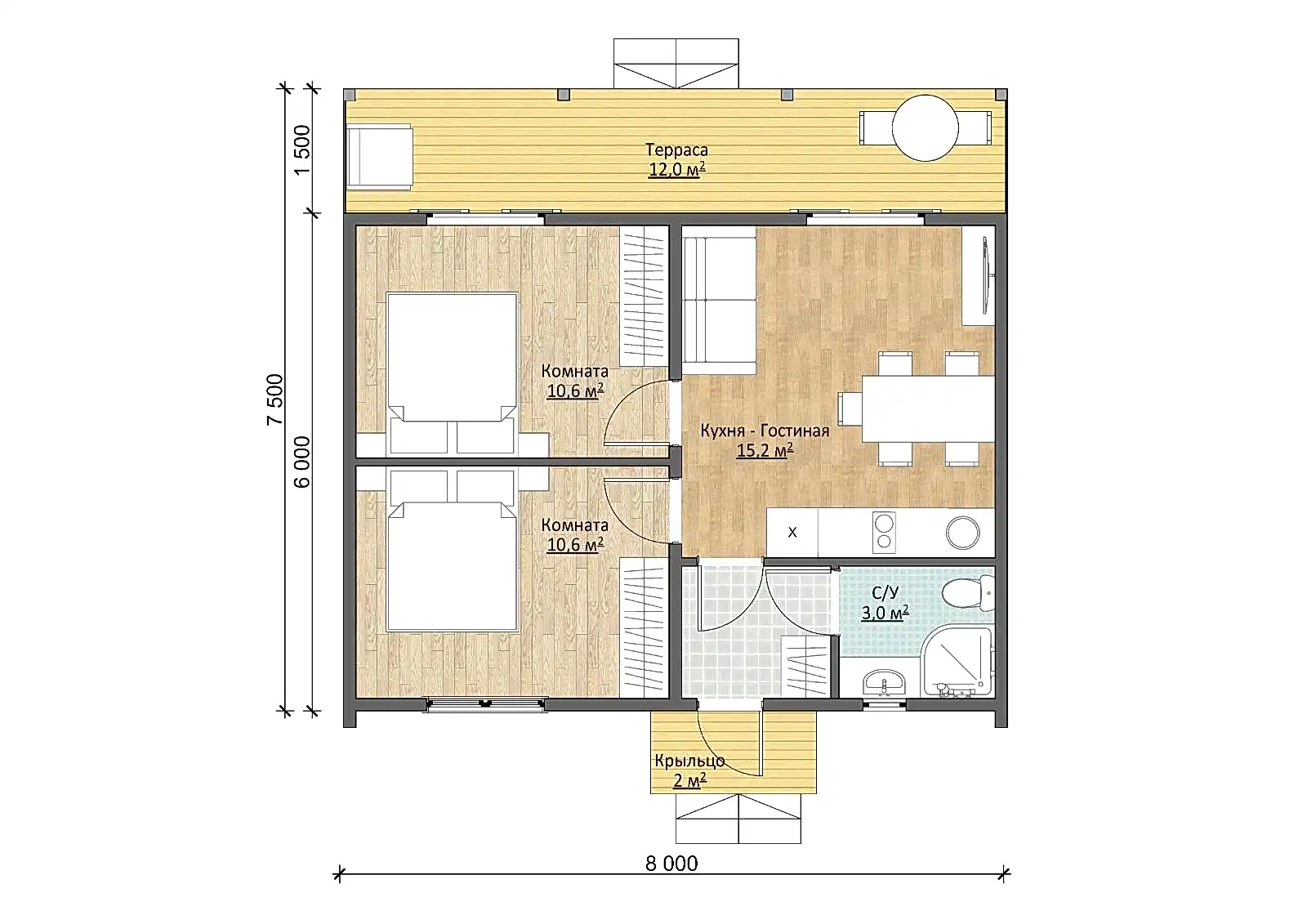 В доме предусмотрено несколько комнат: просторная гостиная, совмещенная с кухонной зоной, и две спальни. Есть компактная ванная и небольшой тамбур. PinUp находится терраса, где можно организовать дополнительные места для отдыха.