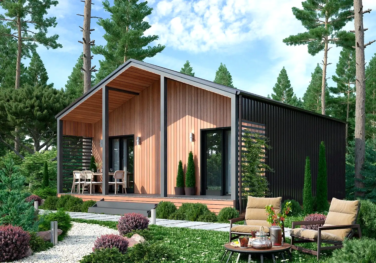 Компактная конструкция одноэтажного деревянного дома в стиле Барн идеально подходит для отдыха или жизни за городом. Высокотехнологичный свайно-винтовой фундамент, современные утеплители перекрытий и стен надежно защищают от непогоды, обеспечивают комфортный микроклимат PinUp помещения в любое время года. Крыша из профилированного листа или металлочерепицы служит много лет, широкие окна из ПВХ-профиля обеспечивают хорошее освещение и обзор окружающего пространства.