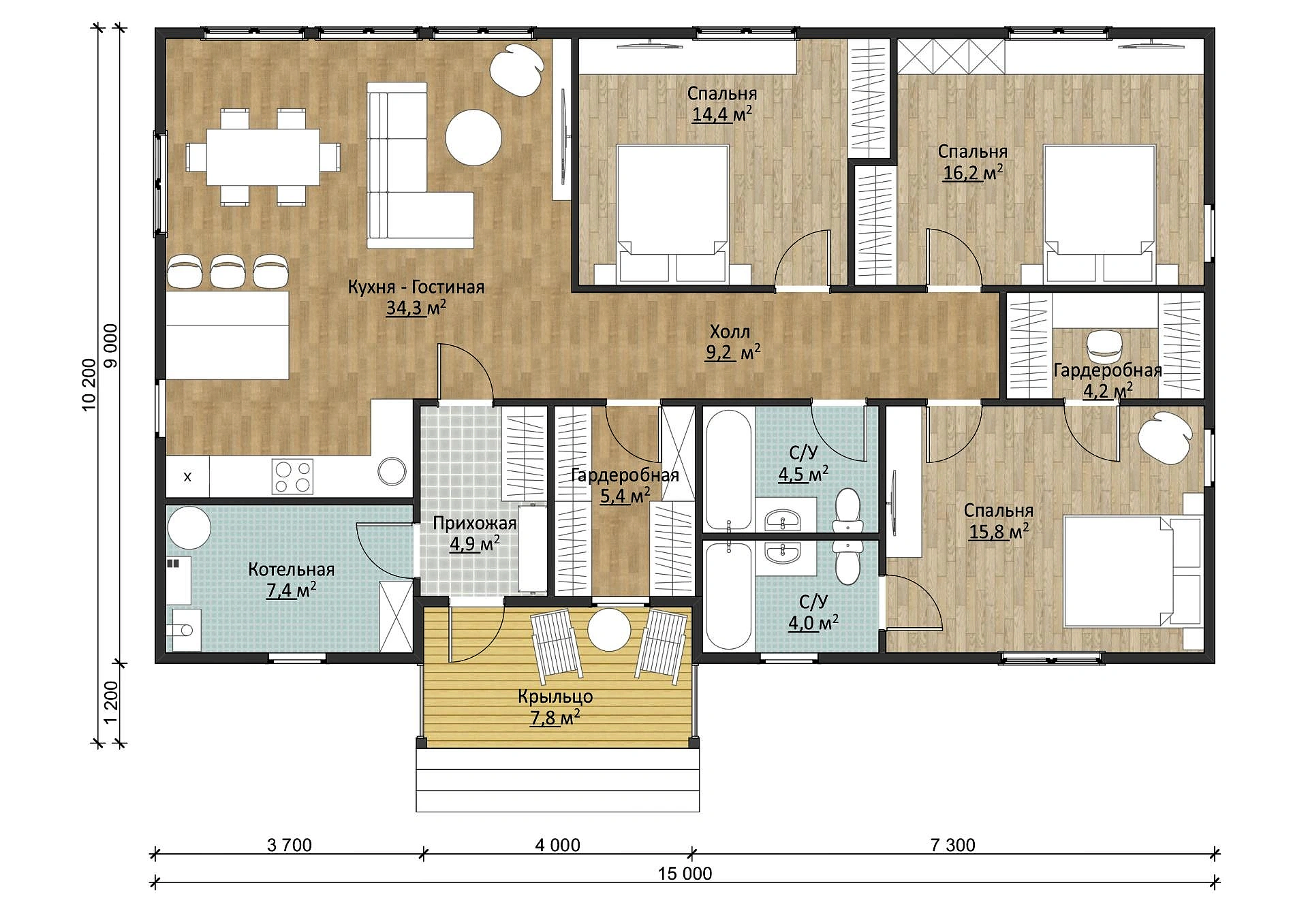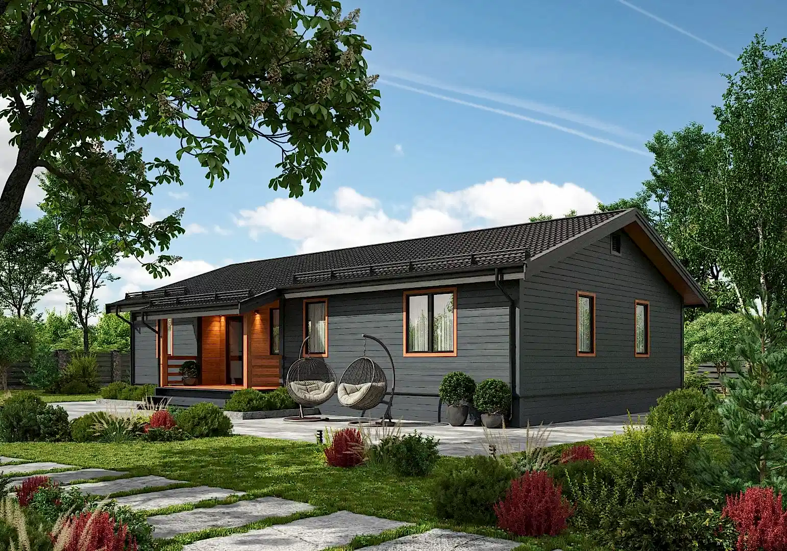 Одноэтажный коттедж с кухней-гостиной, 3-мя спальнями, PinUp санузлами, 2-мя гардеробными и котельной с общей площадью 128.1м2сочетает в PinUp великолепие, простор и изысканность. Это прекрасное архитектурное решение для жизни большой семьи за городом.