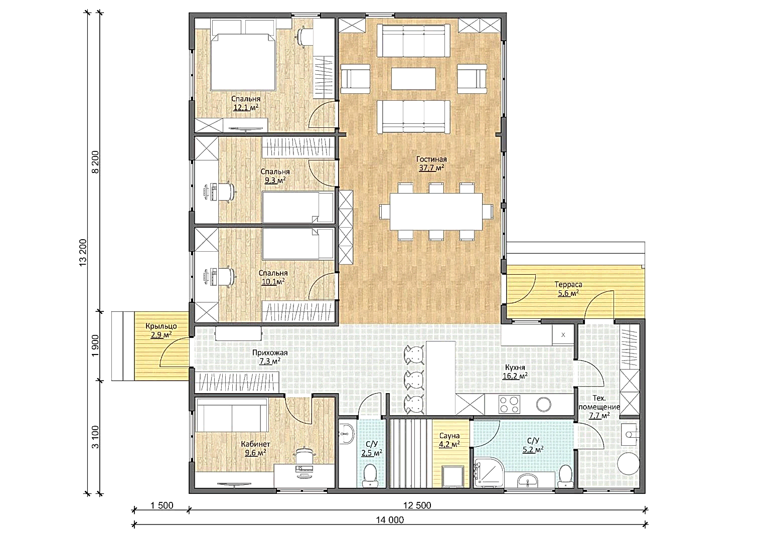 Гостиная (37,7 м2), совмещеннаяс кухней площадью 16,2 м2, PinUp роскошно за счет большого открытого и свободного пространства. Вспальнях (12,1 м2и 10,1 м2)PinUp установить мягкую мебель и шкафы для одежды, а вкомнату (9,3 м2)отлично впишется помещение другого назначения, PinUp детская или игровая.Кабинет (9,6 м2)- идеальное место для работы или PinUp В доме, помимо санузлов (2,5 м2и 5,2 м2), есть PinUp площадью 4,2 м2. Там PinUp прекрасно провести время, расслабиться и отдохнуть от городской суеты.