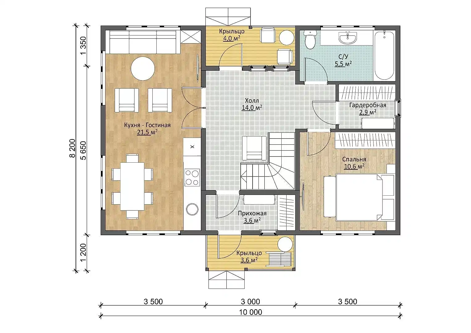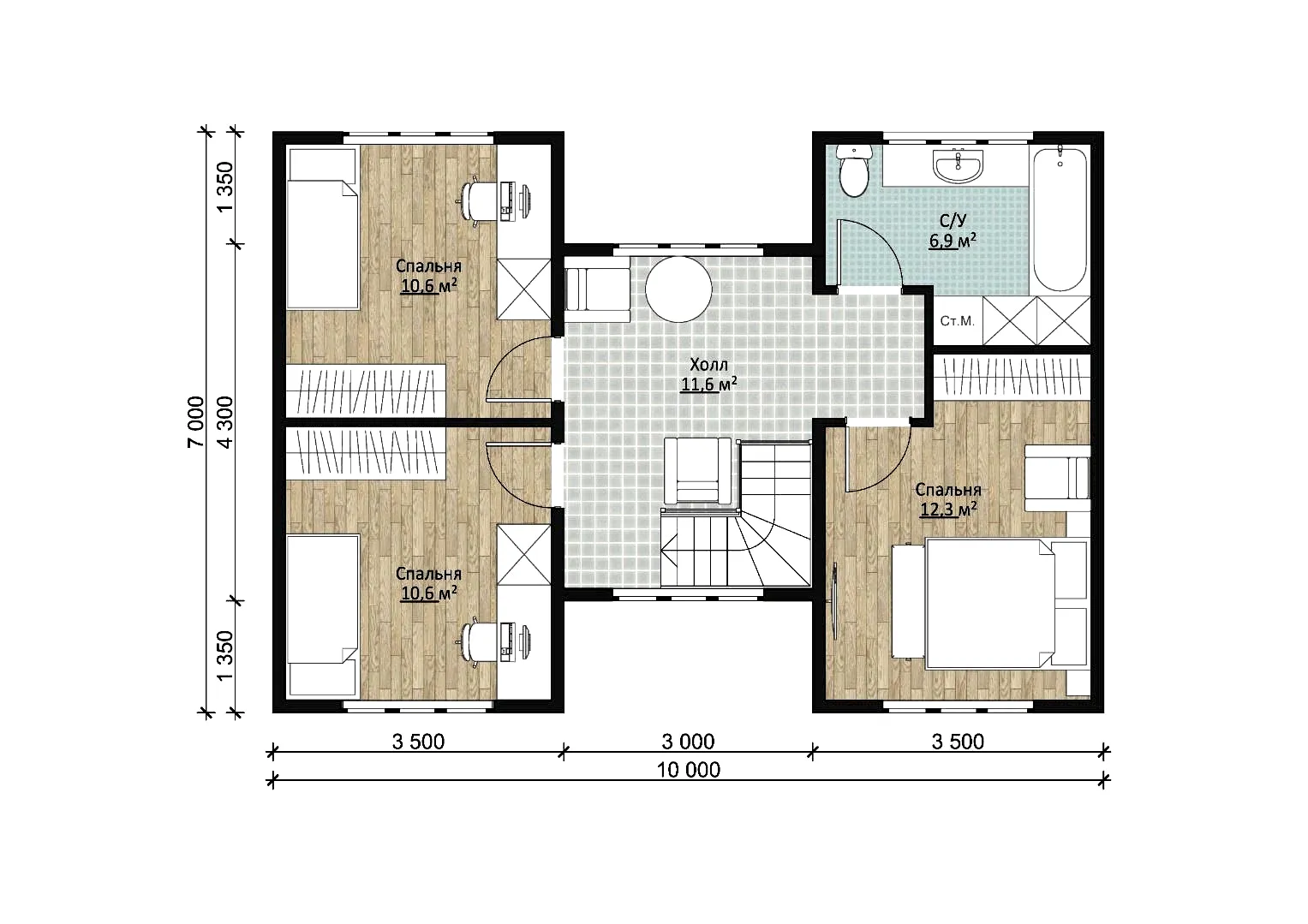 Проект коттеджа Статус 7х10 Парус П2 вмещает в себе: 4 комнаты свободного назначения (спальня, детская, игровая, комната отдыха и т.д.), 2 санузла, кухню-гостиную и гардеробную.