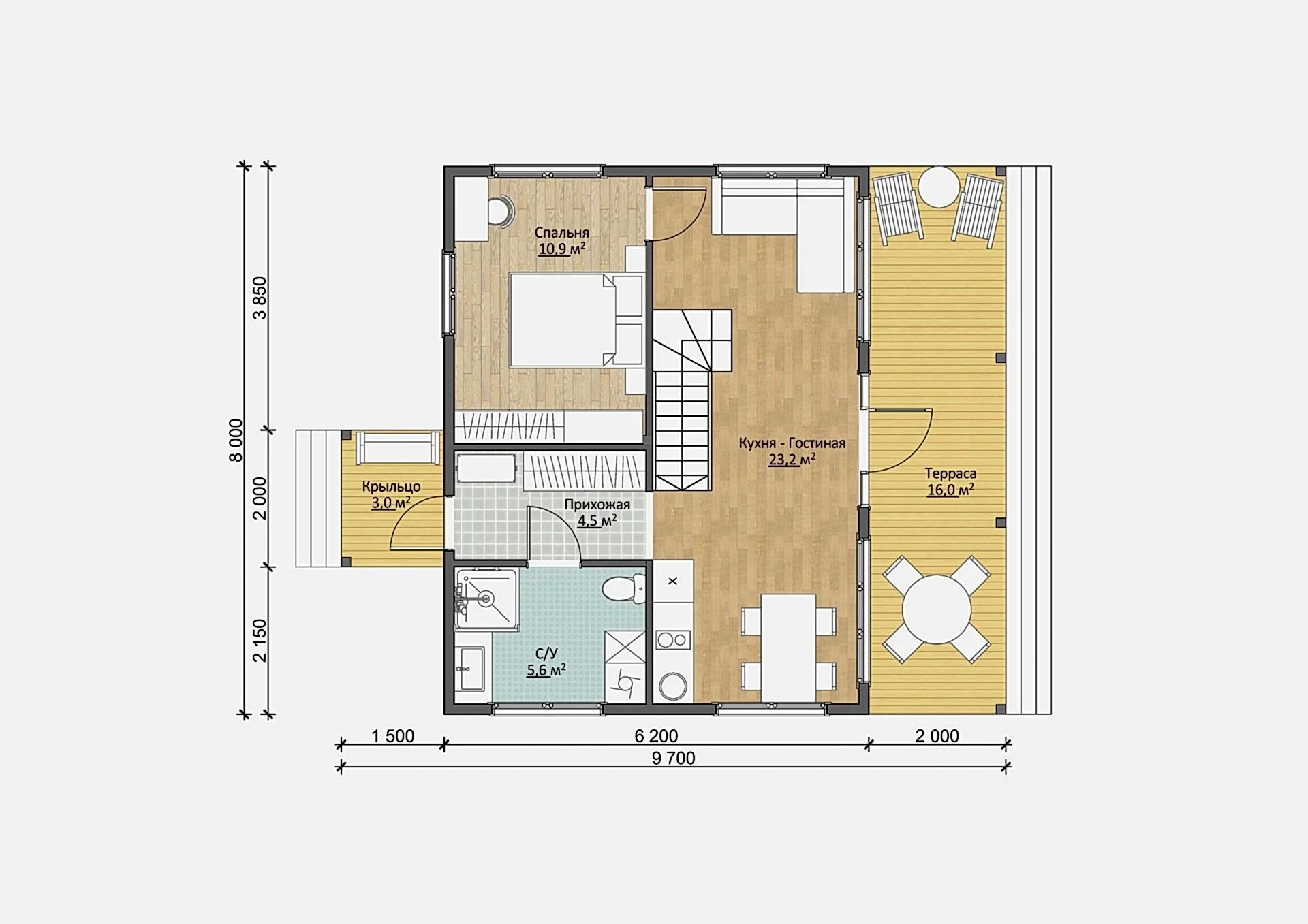 На PinUp нас встречает небольшое крыльцо площадью 3 м2, ведущее в прихожую (4,5 м2), где вы можете с комфортом переодеться, разуться, зайти в санузел (5,6 м2), чтобы помыть руки, и пройти в просторную кухню-гостиную площадью 23,2 м2.