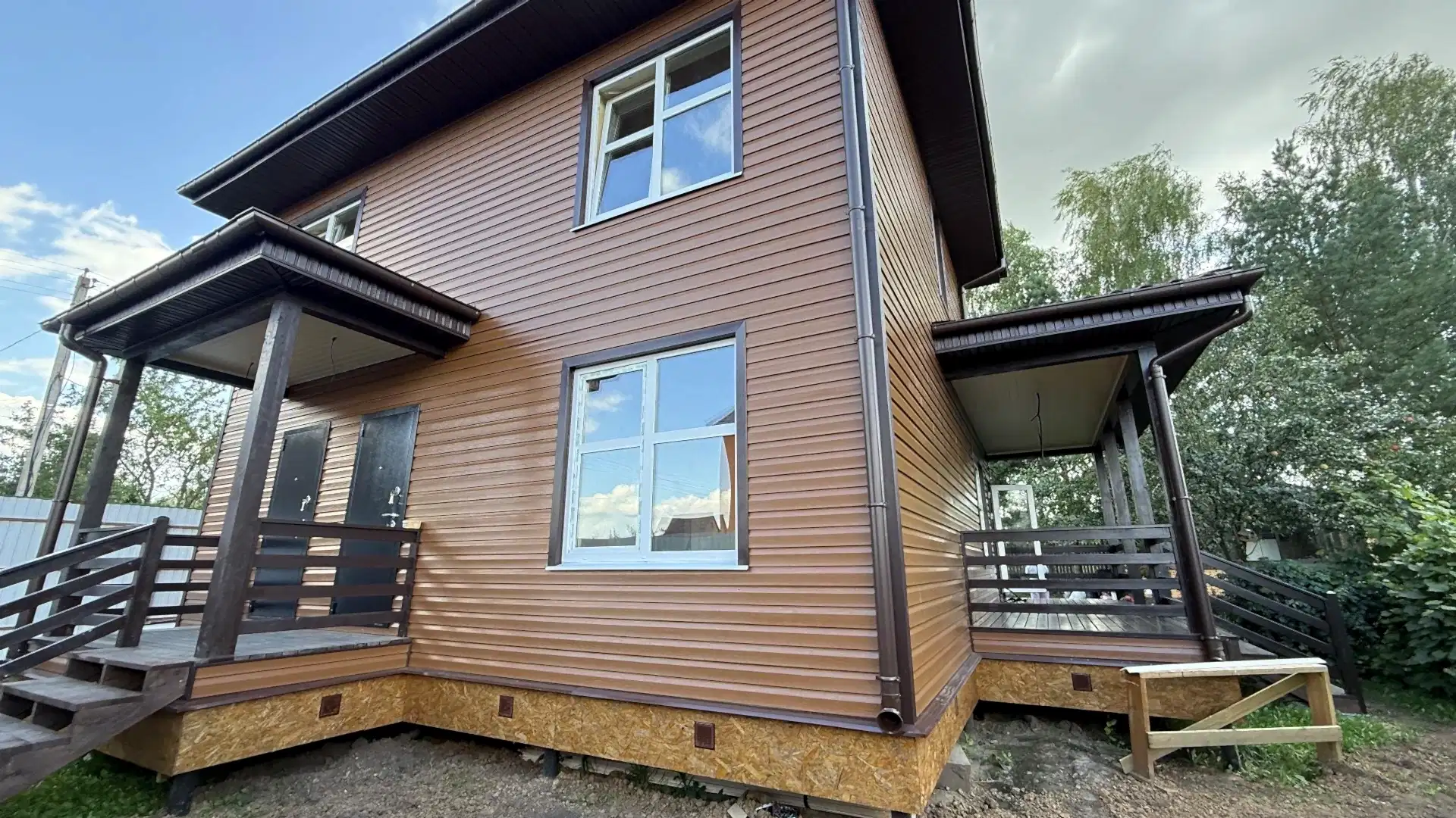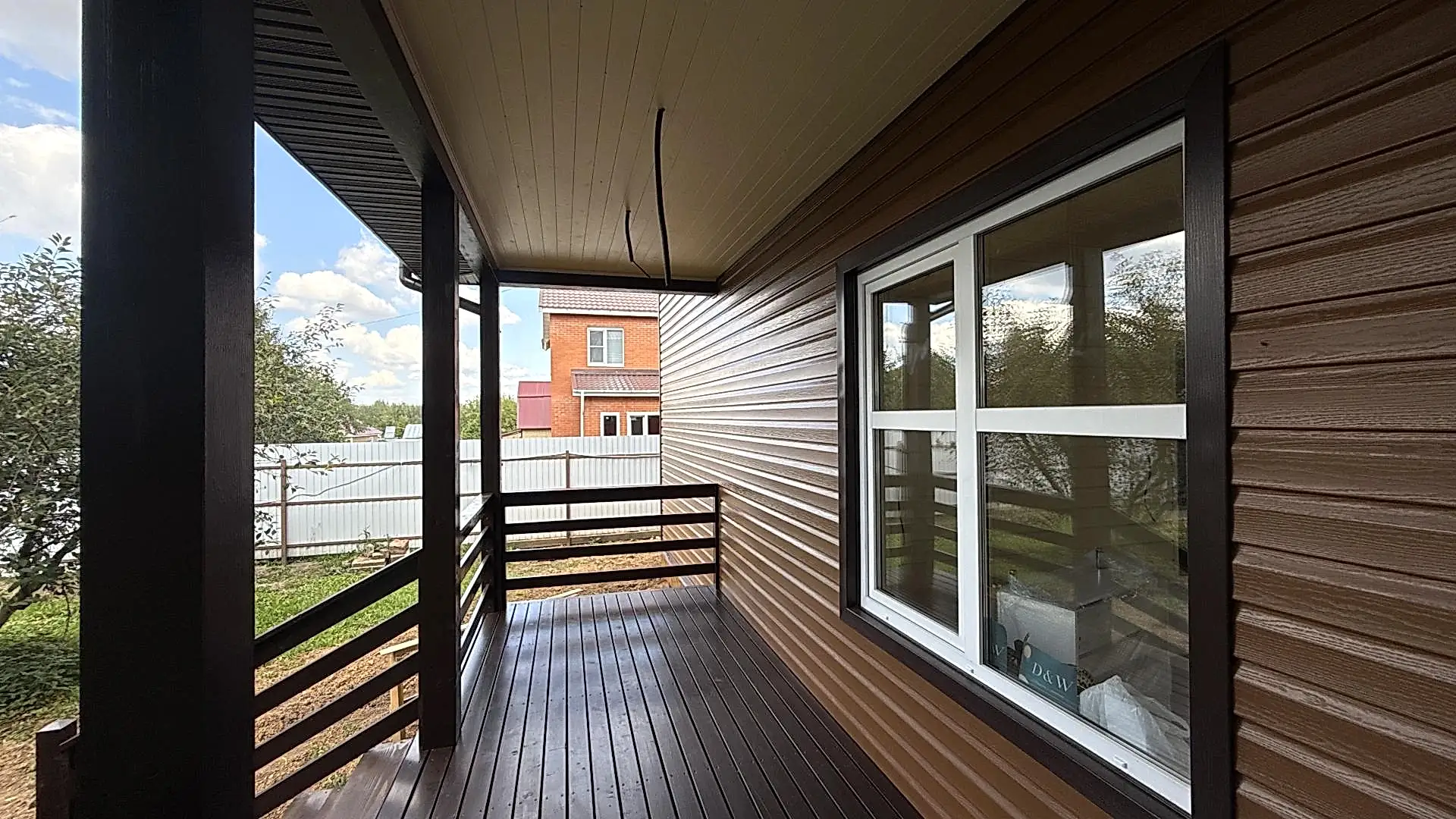 Свайно-винтовой (сваи D=108 м, PinUp мм). Нижняя обвязка - труба профильная металлическая 120х80 мм. Гидроизоляция фундамента - рубероид в два слоя. Монтажная доска ПМК обработана огнебиозащитой. Отделка фундамента дома ОСП-9 по обрешетке П По фундаменту установлены отливы (цвет белый).
