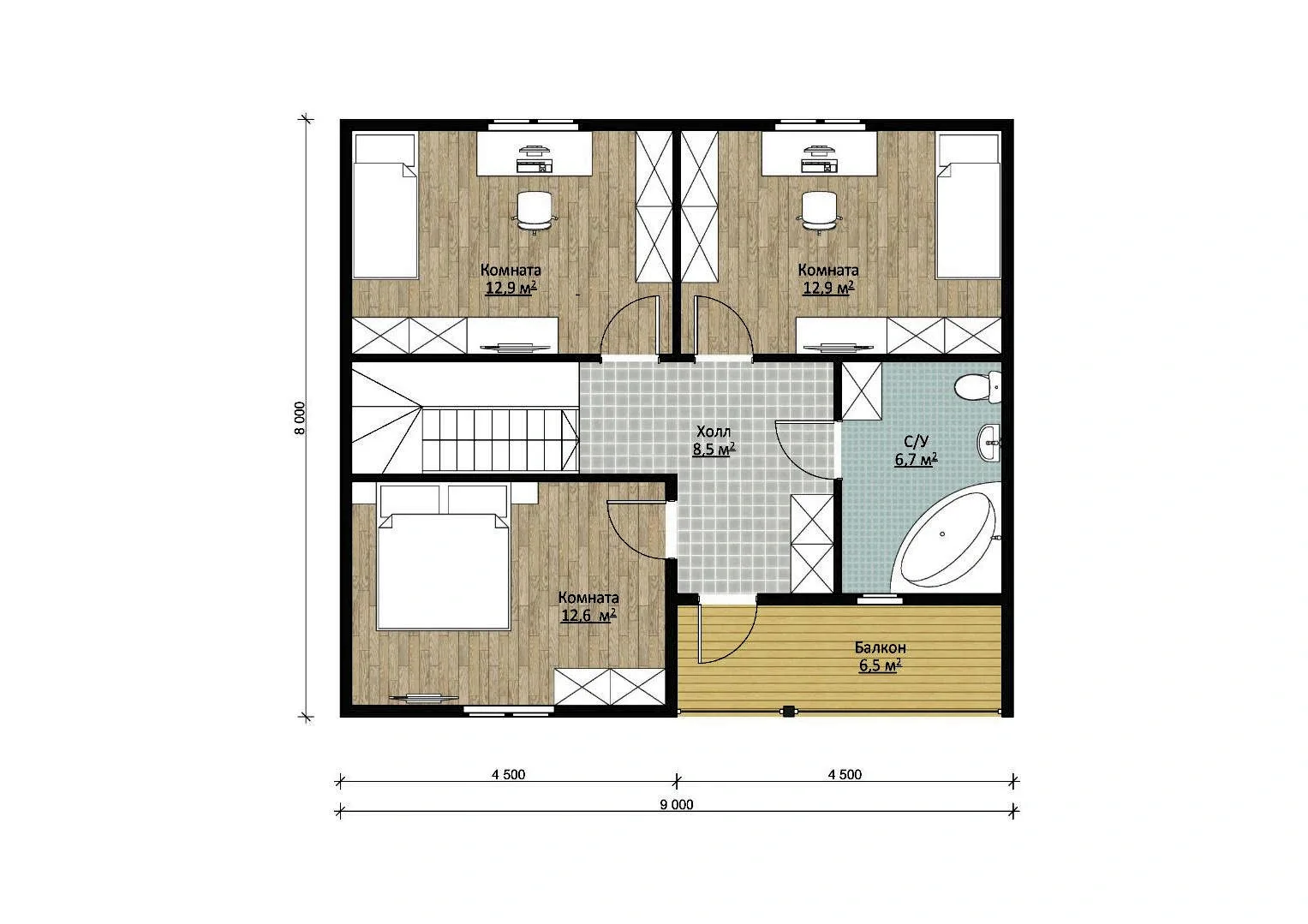 На втором этаже остальныетри спальни - две PinUp м2и одна 12,6 м2. А в холле есть свободное пространство, которое можно использовать как место для PinUp вещей.