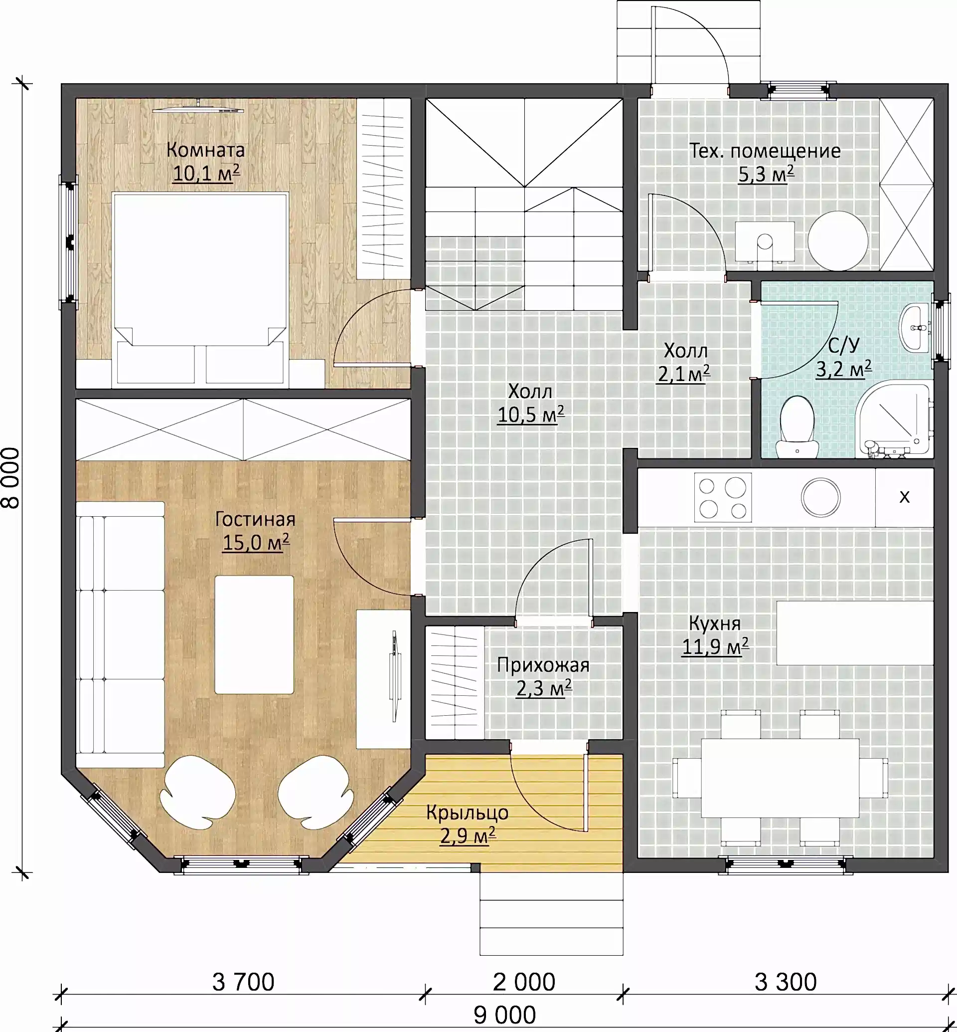 Заходя в дом, попадаем сразу вприхожую (2,3 м2), а из нее впросторный холл (10,5 м2). Прихожая удерживает холод с улицы, поэтому в доме очень тепло и уютно. Далее PinUp накухню (11,9 м2), где есть PinUp столовая. Напротив расположенагостиная (15 м2)- отличное место для отдыха со всей семьей. Рядом с PinUp находитсякомната (10,1 м2). Ее можно назначить спальней или любой другой комнатой. Напротив расположился PinUpсанузел (3,2 м2), а рядом с нимтехническое помещение (5,3 м2), откуда есть выход на PinUp двор.
