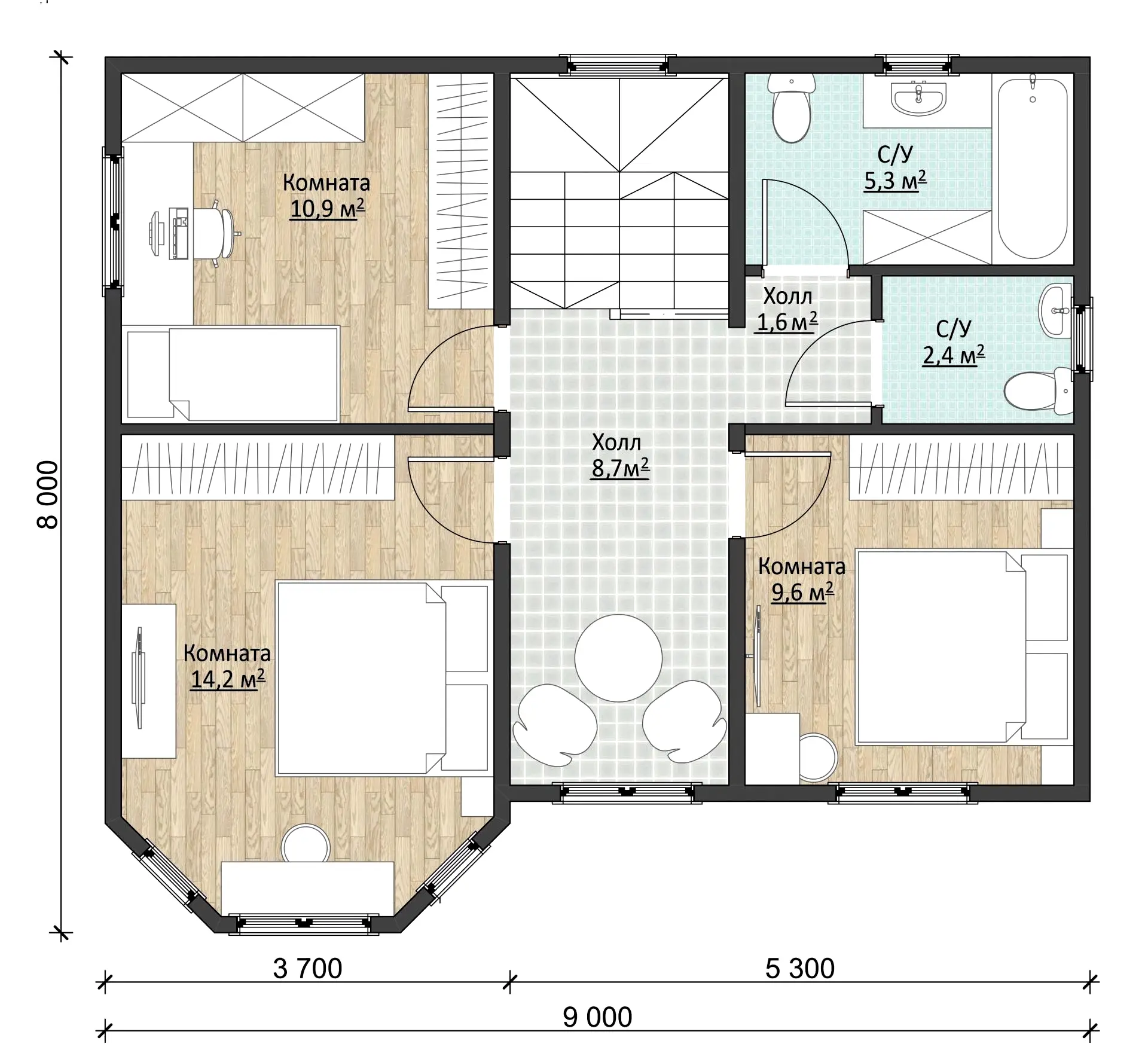 Поднимаемся на второй PinUp и попадаем в не менее просторныйхолл (8,7 м2). Из PinUp можно зайти втри комнаты площадью 9,6 м2, 10,9 м2и 14,2 м2. Назначение комнат выбирает заказчик.