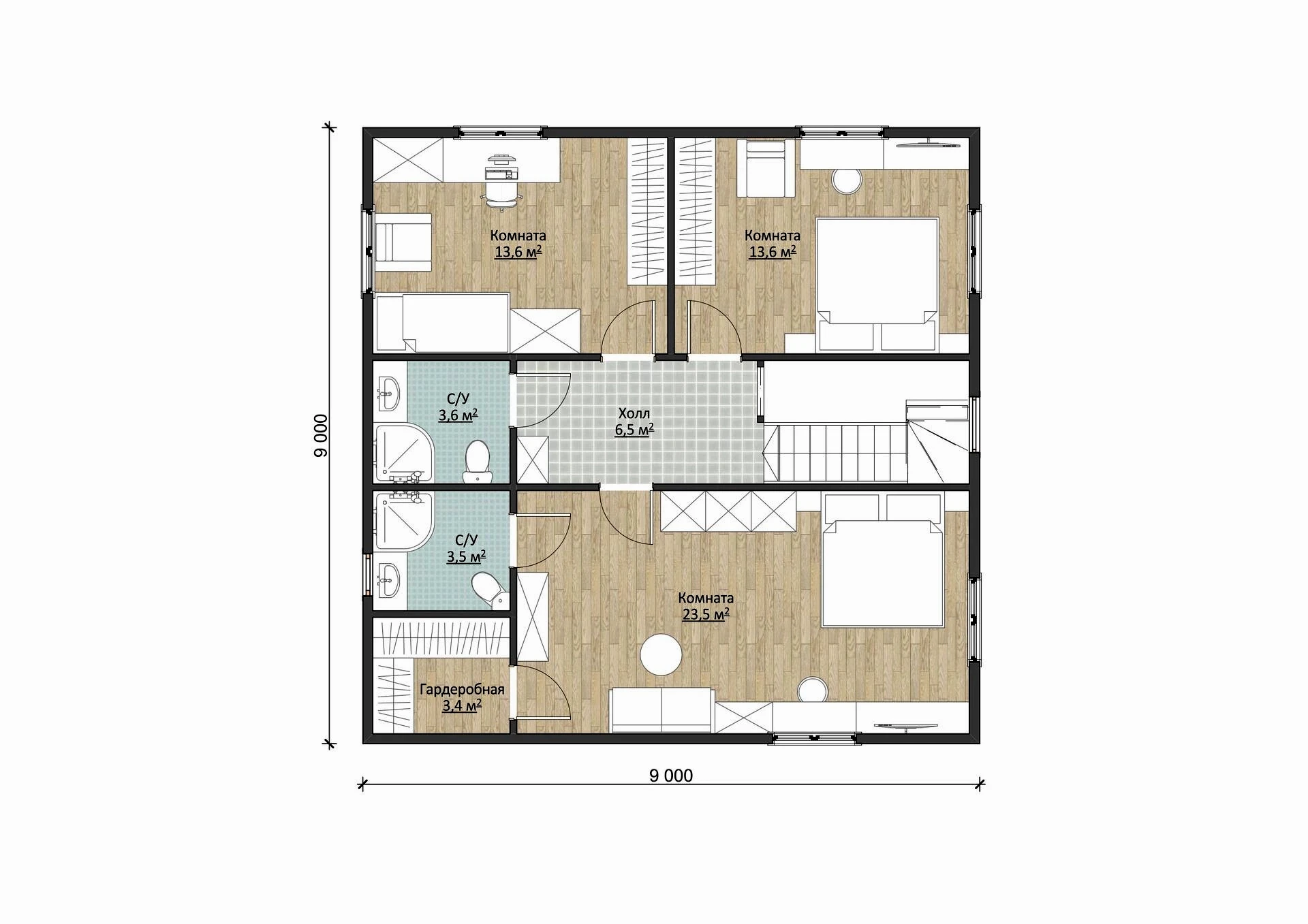 Проект коттеджа вмещает в себе:4 комнаты свободного назначения (спальня, детская, игровая, комната отдыха и т.д.), 3 санузла, гостиную, кухню, техническое помещение и гардеробную.