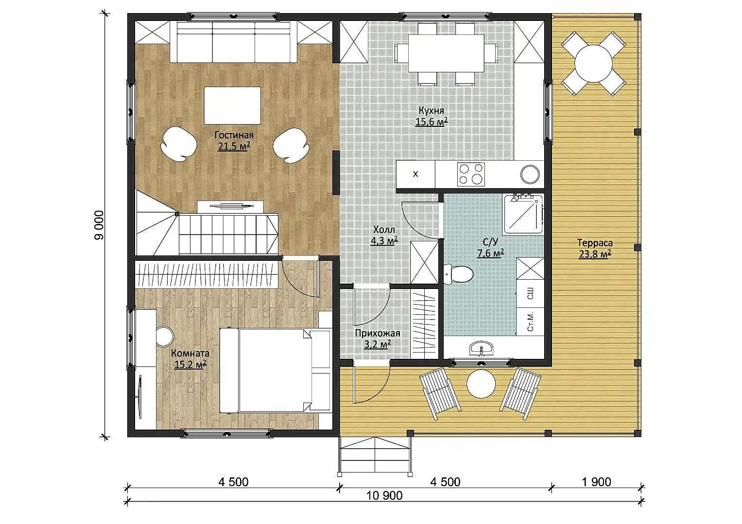 Начнем стеррасы площадью 23,8 м2. На ней поместится все - от хозяйственных принадлежностей до гриля и садовой мебели. Терраса станет любимым местом отдыха всей семьи в теплые времена PinUp