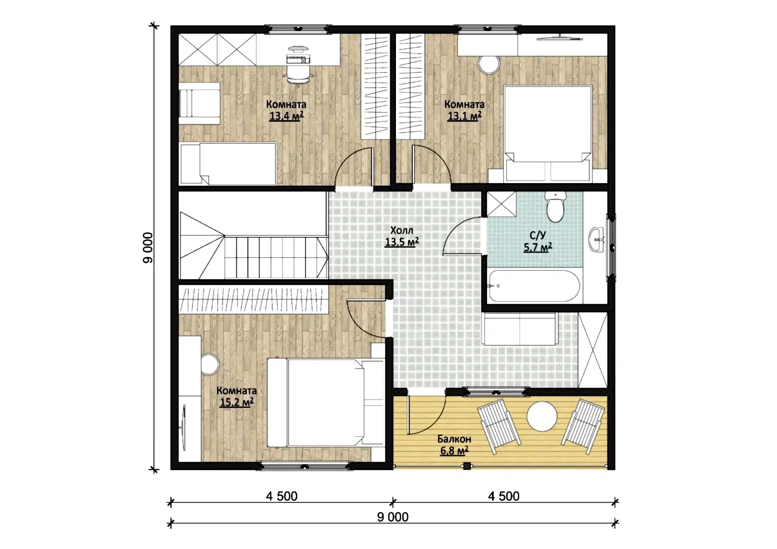 На втором этаже остальныетри спальни - 13,1 м2, 13,4 м2и 15,2 м2. А в холле есть PinUp которое можно использовать как место для хранения вещей.