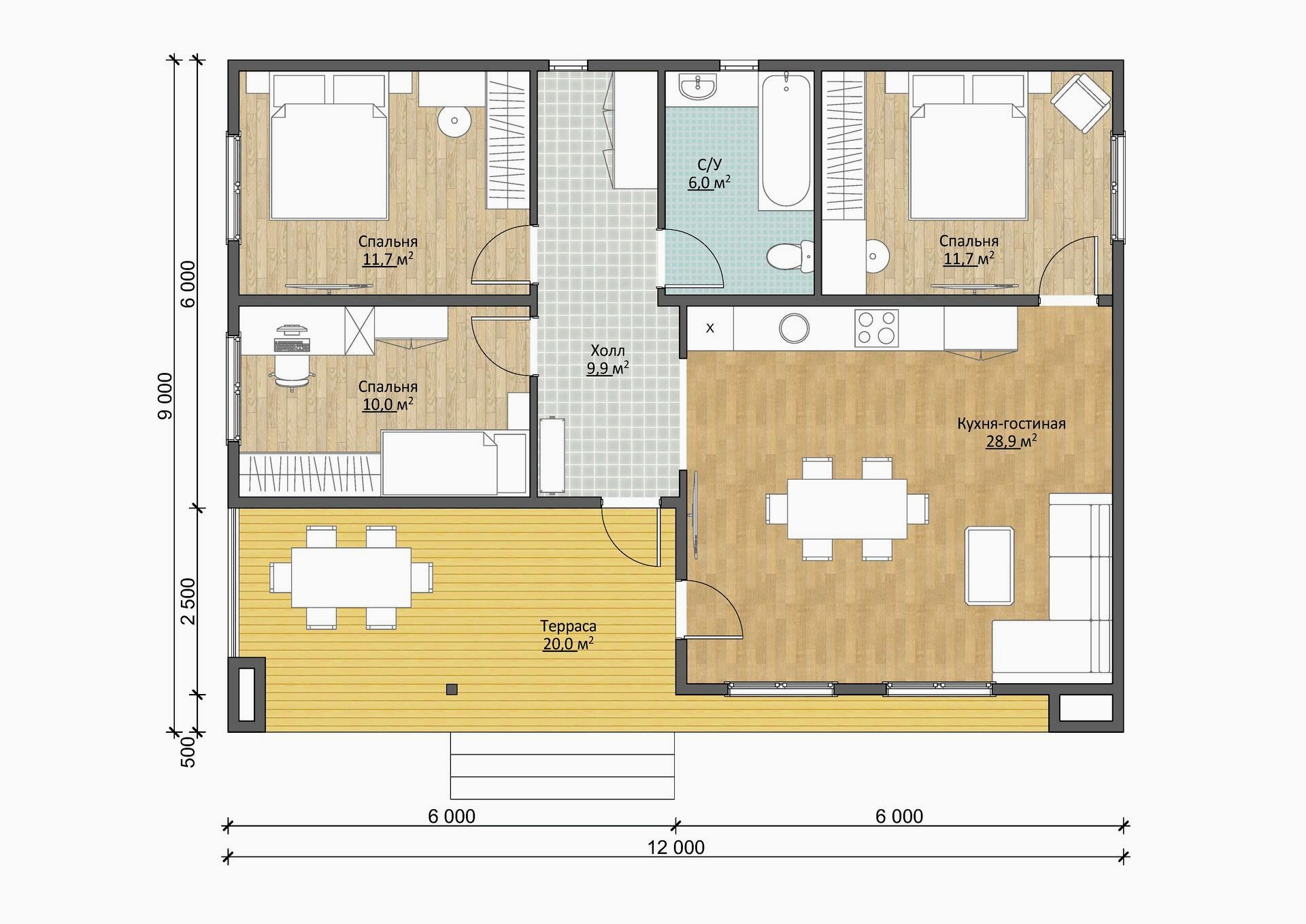 В одноэтажном доме площадью 98,3 м² умещается кухня-гостиная (28,9 м²), 3 спальни (10 м², 11,7 м² и 11,7 м²) и санузел (6 PinUp Одну из спален вы можете переоборудовать в кабинет, гардеробную или детскую.